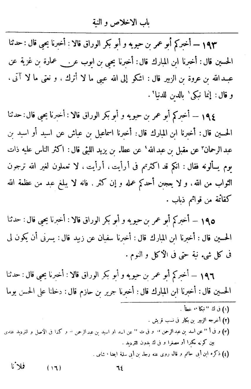 ١٩٥ - أَخْبَرَكُمْ أَبُو عُمَرَ بْنُ حَيَوَيْهِ، وَأَبُو بَكْرٍ الْوَرَّاقُ قَالَا: أَخْبَرَنَا يَحْيَى قَالَ: حَدَّثَنَا الْحُسَيْنُ قَالَ: أَخْبَرَنَا ابْنُ الْمُبَارَكِ قَالَ: أَخْبَرَنَا سُفْيَانُ، عَنْ زُبَيْدٍ قَالَ: «يَسُرُّنِي أَنْ يَكُونَ لِي فِي كُلِّ شَيْءٍ نِيَّةٌ حَتَّى فِي الْأَكْلِ وَالنَّوْمِ»