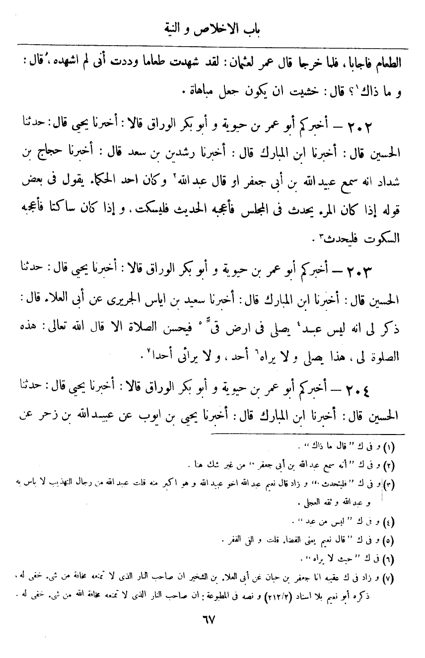 ٢٠٣ - أَخْبَرَكُمْ أَبُو عُمَرَ بْنُ حَيَوَيْهِ، وَأَبُو بَكْرٍ الْوَرَّاقُ قَالَا: حَدَّثَنَا يَحْيَى قَالَ: حَدَّثَنَا الْحُسَيْنُ قَالَ: أَخْبَرَنَا ابْنُ الْمُبَارَكِ قَالَ: أَخْبَرَنَا سَعِيدُ بْنُ إِيَاسٍ الْجُرَيْرِيُّ، عَنْ أَبِي الْعَلَاءِ قَالَ: ذُكِرَ لِي، " أَنَّهُ لَيْسَ عَبْدٌ يُصَلِّي فِي أَرْضٍ قِيٍّ، فَيُحْسِنُ الصَّلَاةَ، إِلَّا قَالَ اللَّهُ تَعَالَى: هَذِهِ الصَّلَاةُ لِي، هَذَا يُصَلِّي وَلَا يَرَاهُ أَحَدٌ، وَلَا يُرَائِي أَحَدًا "