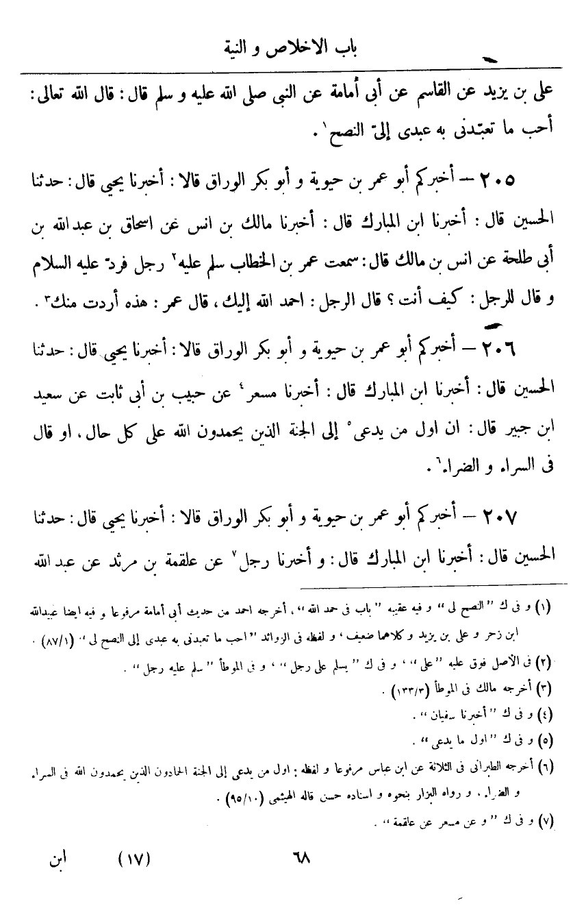 ٢٠٧ - أَخْبَرَكُمْ أَبُو عُمَرَ بْنُ حَيَوَيْهِ، وَأَبُو بَكْرٍ الْوَرَّاقُ قَالَا: أَخْبَرَنَا يَحْيَى قَالَ: حَدَّثَنَا الْحُسَيْنُ قَالَ: أَخْبَرَنَا ابْنُ الْمُبَارَكِ قَالَ: أَخْبَرَنَا رَجُلٌ، عَنْ عَلْقَمَةَ بْنِ مَرْثَدٍ، عَنْ عَبْدِ اللَّهِ ⦗٦٩⦘ بْنِ عُمَرَ قَالَ: «إِنْ كُنَّا لَعَلَّنَا أَنْ نَلْتَقِيَ فِي الْيَوْمِ مِرَارًا يَسْأَلُ بَعْضُنَا بِبَعْضٍ، وَأَنْ نَقْرُبَ ذَلِكَ إِلَّا لِنَحْمَدَ اللَّهَ عَزَّ وَجَلَّ»