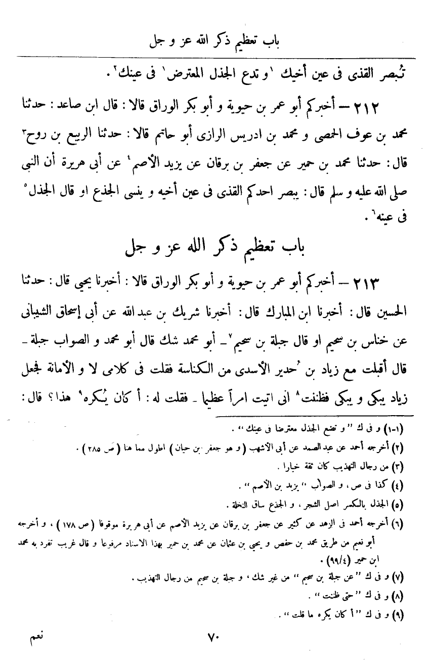 ٢١٣ - أَخْبَرَكُمْ أَبُو عُمَرَ بْنُ حَيَوَيْهِ، وَأَبُو بَكْرٍ الْوَرَّاقُ قَالَا: أَخْبَرَنَا يَحْيَى قَالَ: حَدَّثَنَا الْحُسَيْنُ قَالَ: أَخْبَرَنَا ابْنُ الْمُبَارَكِ قَالَ: أَخْبَرَنَا شَرِيكُ بْنُ عَبْدِ اللَّهِ، عَنْ أَبِي إِسْحَاقَ الشَّيْبَانِيِّ، عَنْ خُنَاسِ بْنِ سُحَيْمٍ أَوْ قَالَ: جَبَلَةَ بْنِ سُحَيْمٍ أَبُو مُحَمَّدٍ شَكَّ، قَالَ أَبُو مُحَمَّدٍ: «وَالصَّوَابُ جَبَلَةُ» قَالَ: أَقْبَلْتُ مَعَ زِيَادِ بْنِ حُدَيْرٍ الْأَسَدِيِّ مِنِ الْكُنَاسَةِ، فَقُلْتُ فِي كَلَامِي: لَا وَالْأَمَانَةِ، فَجَعَلَ زِيَادٌ يَبْكِي وَيَبْكِي، فَظَنَنْتُ أَنِّي أَتَيْتُ أَمْرًا عَظِيمًا، فَقُلْتُ لَهُ: أَكَانَ يُكْرَهُ هَذَا؟ قَالَ ⦗٧١⦘: «نَعَمْ، كَانَ يُنْهَى عَنِ الْحَلِفِ بِالْأَمَانَةِ أَشَدَّ النَّهْيِ»