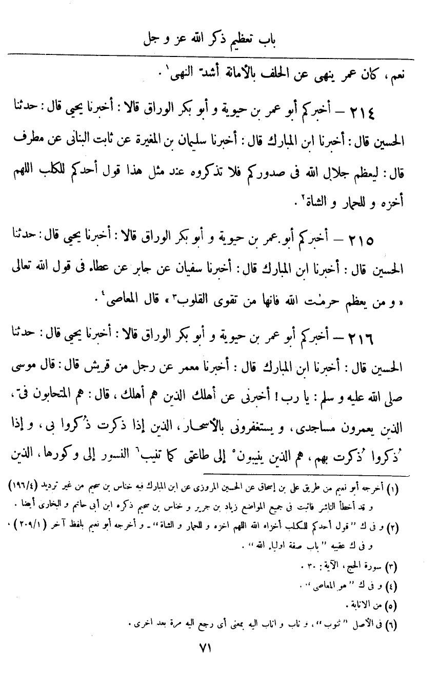 ٢١٤ - أَخْبَرَكُمْ أَبُو عُمَرَ بْنُ حَيَوَيْهِ، وَأَبُو بَكْرٍ الْوَرَّاقُ قَالَا: أَخْبَرَنَا يَحْيَى قَالَ: حَدَّثَنَا الْحُسَيْنُ قَالَ: أَخْبَرَنَا ابْنُ الْمُبَارَكِ قَالَ: أَخْبَرَنَا سُلَيْمَانُ بْنُ الْمُغِيرَةِ، عَنْ ثَابِتٍ الْبُنَانِيِّ، عَنْ مُطَرِّفٍ قَالَ: " لِيَعْظُمْ جَلَالُ اللَّهِ فِي صُدُورِكُمْ، فَلَا تَذْكُرُوهُ عِنْدَ مِثْلِ هَذَا: قَوْلُ أَحَدِكُمْ للْكَلْبِ، اللَّهُمَّ أَخْزِهِ، وَللحِمَارِ وَالشَّاةِ "