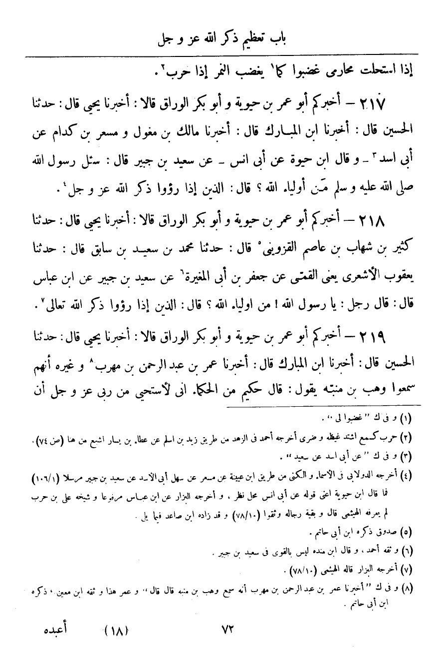 ٢١٧ - أَخْبَرَكُمْ أَبُو عُمَرَ بْنُ حَيَوَيْهِ، وَأَبُو بَكْرٍ الْوَرَّاقُ قَالَا: أَخْبَرَنَا يَحْيَى قَالَ: حَدَّثَنَا الْحُسَيْنُ قَالَ: أَخْبَرَنَا ابْنُ الْمُبَارَكِ قَالَ: أَخْبَرَنَا مَالِكُ بْنُ مِغْوَلٍ، وَمِسْعَرُ بْنُ كِدَامٍ، عَنْ أَبِي أَسَدٍ، وَقَالَ: ابْنُ حَيْوَةَ، عَنْ أَبِي أَنَسٍ، عَنْ سَعِيدِ بْنِ جُبَيْرٍ، قَالَ: سُئِلَ رَسُولُ اللَّهِ صَلَّى اللهُ عَلَيْهِ وَسَلَّمَ: مَنْ أَوْلِيَاءُ اللَّهِ؟ قَالَ: «الَّذِينَ إِذَا رُؤُوا ذُكِرَ اللَّهُ عَزَّ وَجَلَّ»
