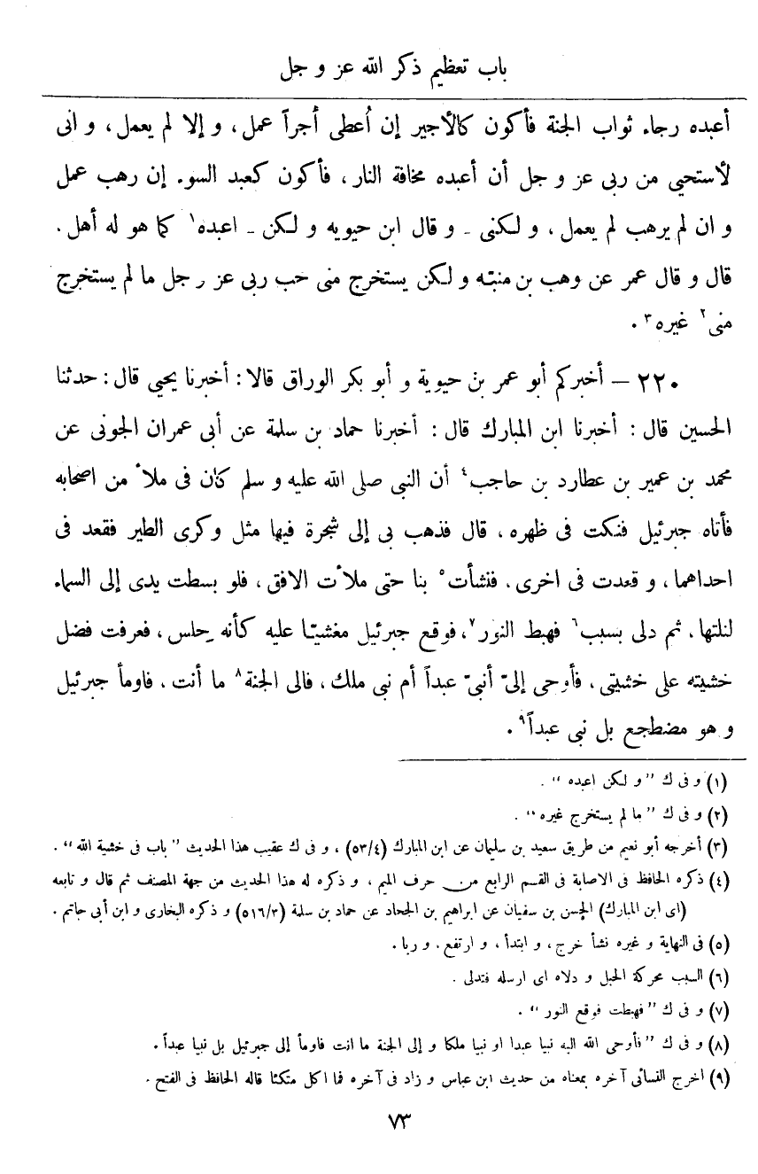 ٢٢٠ - أَخْبَرَكُمْ أَبُو عُمَرَ بْنُ حَيَوَيْهِ، وَأَبُو بَكْرٍ الْوَرَّاقُ قَالَا: أَخْبَرَنَا يَحْيَى قَالَ: حَدَّثَنَا الْحُسَيْنُ قَالَ: أَخْبَرَنَا ابْنُ الْمُبَارَكِ قَالَ: أَخْبَرَنَا حَمَّادُ بْنُ سَلَمَةَ، عَنْ أَبِي عِمْرَانَ الْجَوْنِيِّ، عَنْ مُحَمَّدِ بْنِ عُمَيْرِ بْنِ عُطَارِدَ بْنِ حَاجِبٍ، أَنَّ النَّبِيَّ صَلَّى اللهُ عَلَيْهِ وَسَلَّمَ كَانَ فِي مَلَأٍ مِنْ أَصْحَابِهِ، فَأَتَاهُ جَبْرَئِيلُ، فَنَكَتَ فِي ظَهْرِهِ، قَالَ: " فَذَهَبَ بِي إِلَى شَجَرَةٍ فِيهَا مِثْلُ وَكْرَيِ الطَّيْرِ، فَقَعَدَ فِي إِحْدَاهُمَا، وَقَعَدْتُ فِي أُخْرَى، فَنَشَأَتْ بِنَا حَتَّى مَلَأَتِ الْأُفُقَ، فَلَوْ بَسَطْتُ يَدِي إِلَى السَّمَاءِ لَنِلْتُهَا، ثُمَّ دُلِّيَ بِسَبَبٍ فَهَبَطَ النُّورُ، فَوَقَعَ جَبْرَئِيلُ مَغْشِيًّا عَلَيْهِ، كَأَنَّهُ حِلْسٌ، فَعَرَفْتُ فَضْلَ خَشْيَتِهِ عَلَى خَشْيَتِي، فَأُوحِيَ إِلَيَّ: أنَبِيًّا عَبْدًا أَمْ نَبِيًّا مَلِكًا؟ فَإِلَى الْجَنَّةِ مَا أَنْتَ، فَأَوْمَأَ جَبْرَئِيلُ وَهُوَ مُضْطَجِعٌ: بَلْ نَبِيٌّ عَبْدٌ "