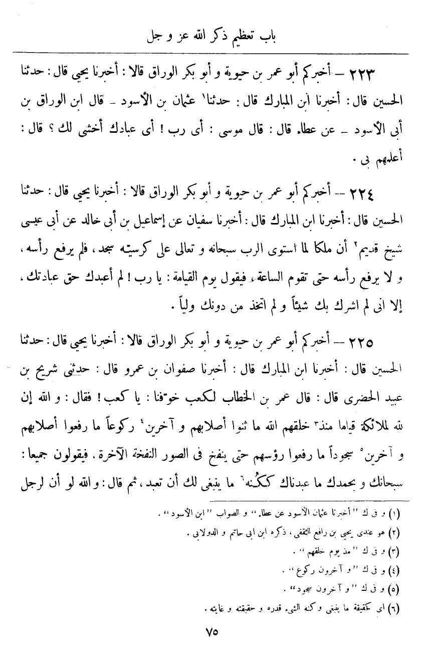 ٢٢٣ - أَخْبَرَكُمْ أَبُو عُمَرَ بْنُ حَيَوَيْهِ، وَأَبُو بَكْرٍ الْوَرَّاقُ قَالَا: حَدَّثَنَا يَحْيَى قَالَ: حَدَّثَنَا الْحُسَيْنُ قَالَ: أَخْبَرَنَا ابْنُ الْمُبَارَكِ قَالَ: حَدَّثَنَا عُثْمَانُ بْنُ الْأَسْوَدِ قَالَ: ابْنُ الْوَرَّاقِ بْنُ أَبِي الْأَسْوَدِ، عَنْ عَطَاءٍ قَالَ: " قَالَ مُوسَى: أَيْ رَبِّ، أَيُّ عِبَادِكَ أَخْشَى لَكَ؟ قَالَ: أَعْلَمُهُمْ بِي "