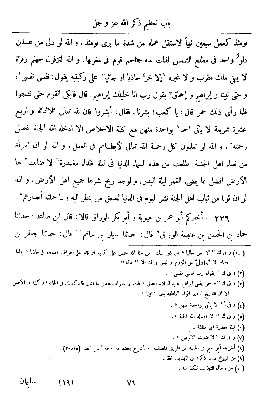 ٢٢٦ - أَخْبَرَكُمْ أَبُو عُمَرَ بْنُ حَيَوَيْهِ، وَأَبُو بَكْرٍ الْوَرَّاقُ قَالَا: قَالَ ابْنُ صَاعِدٍ: حَدَّثَنَا حَمَّادُ بْنُ الْحَسَنِ بْنِ عَنْبَسَةَ الْوَرَّاقُ قَالَ: حَدَّثَنَا سَيَّارُ بْنُ حَاتِمٍ قَالَ: حَدَّثَنَا جَعْفَرُ بْنُ ⦗٧٧⦘ سُلَيْمَانَ، وَالْحَارِثُ بْنُ نَبْهَانَ، عَنْ مَالِكِ بْنِ دِينَارٍ، عَنْ شَهْرِ بْنِ حَوْشَبٍ، عَنْ سَعِيدِ بْنِ عَامِرِ بْنِ حُذَيْمٍ، قَالَ: سَمِعْتُ رَسُولَ اللَّهِ صَلَّى اللهُ عَلَيْهِ وَسَلَّمَ يَقُولُ: «لَوْ أَنَّ امْرَأَةً مِنْ نِسَاءِ أَهْلِ الْجَنَّةِ أَشْرَفَتْ إِلَى أَهْلِ الْأَرْضِ، لَمَلَأَتِ الْأَرْضَ رِيحَ مِسْكٍ، وَلَأَذْهَبَتْ ضَوْءَ الشَّمْسِ وَالْقَمَرِ، وَإِنِّي وَاللَّهِ مَا كُنْتُ لَأَخْتَارُكَ عَلَيْهِنَّ»