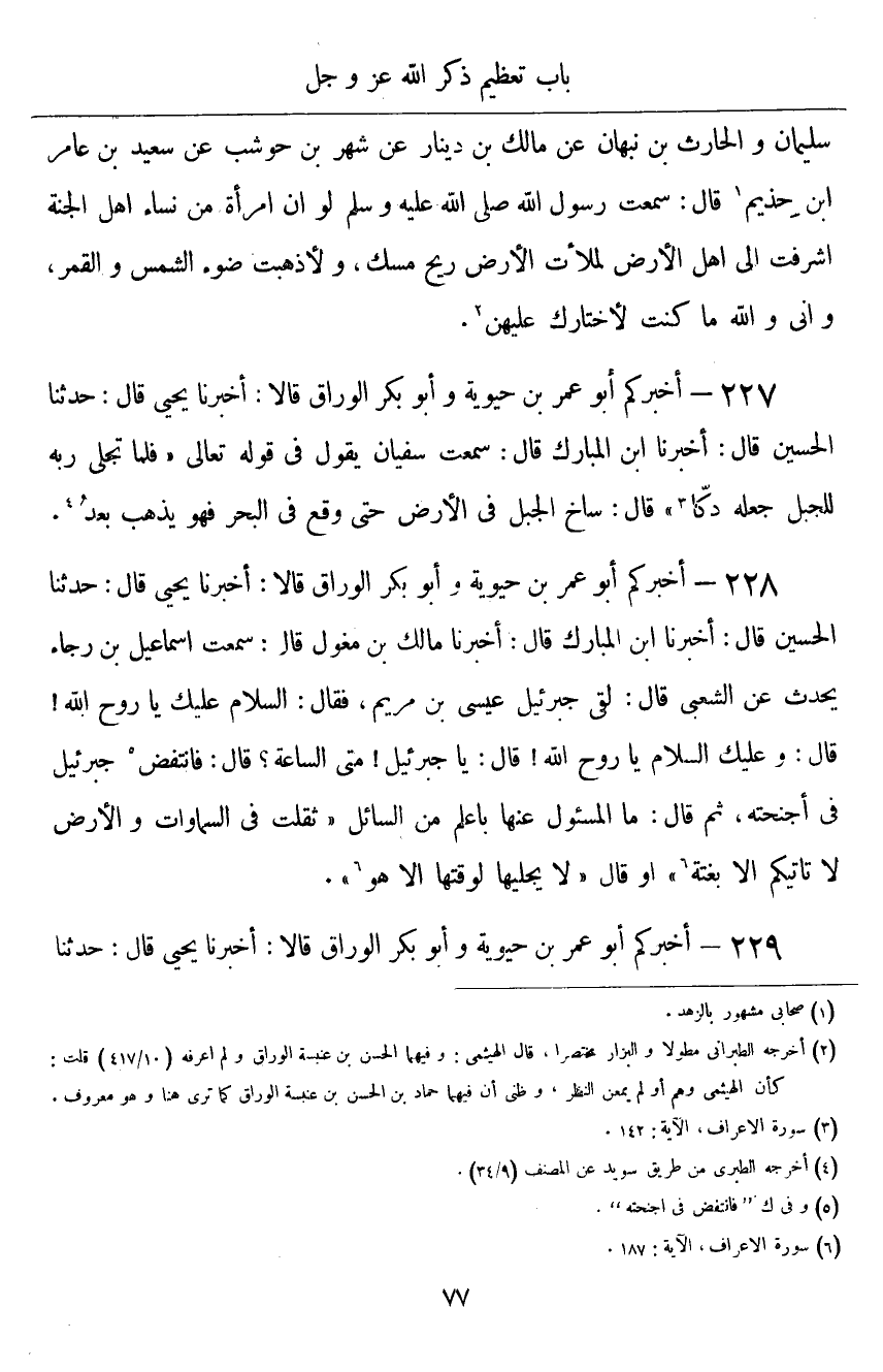 ٢٢٧ - أَخْبَرَكُمْ أَبُو عُمَرَ بْنُ حَيَوَيْهِ، وَأَبُو بَكْرٍ الْوَرَّاقُ قَالَا: أَخْبَرَنَا يَحْيَى قَالَ: حَدَّثَنَا الْحُسَيْنُ قَالَ: أَخْبَرَنَا ابْنُ الْمُبَارَكِ قَالَ: سَمِعْتُ سُفْيَانَ، يَقُولُ فِي قَوْلِهِ تَعَالَى: {فَلَمَّا تَجَلَّى رَبُّهُ لِلْجَبَلِ جَعَلَهُ دَكًّا} [الأعراف: ١٤٣] ، قَالَ: «سَاخَ الْجَبَلُ فِي الْأَرْضِ حَتَّى وَقَعَ فِي الْبَحْرِ فَهُوَ يَذْهَبُ بَعْدُ»