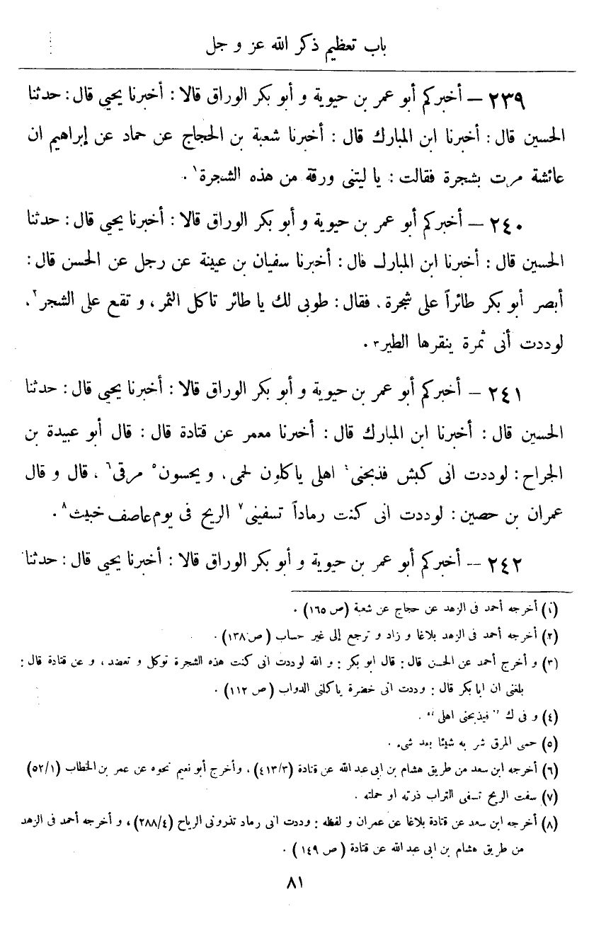 ٢٣٩ - أَخْبَرَكُمْ أَبُو عُمَرَ بْنُ حَيَوَيْهِ، وَأَبُو بَكْرٍ الْوَرَّاقُ قَالَا: أَخْبَرَنَا يَحْيَى قَالَ: حَدَّثَنَا الْحُسَيْنُ قَالَ: أَخْبَرَنَا ابْنُ الْمُبَارَكِ قَالَ: أَخْبَرَنَا شُعْبَةُ بْنُ الْحَجَّاجِ، عَنْ حَمَّادٍ، عَنْ إِبْرَاهِيمَ، أَنَّ عَائِشَةَ مَرَّتْ بِشَجَرَةٍ فَقَالَتْ: «يَا لَيْتَنِي وَرَقَةٌ مِنْ هَذِهِ الشَّجَرَةِ» يَا لَيْتَنِي وَرَقَةٌ " كَذَا فِي الْأَصْلِ، وَفِي الزُّهْدِ لِأَحْمَدَ يَا لَيْتَنِي كُنْتُ وَرَقَةً