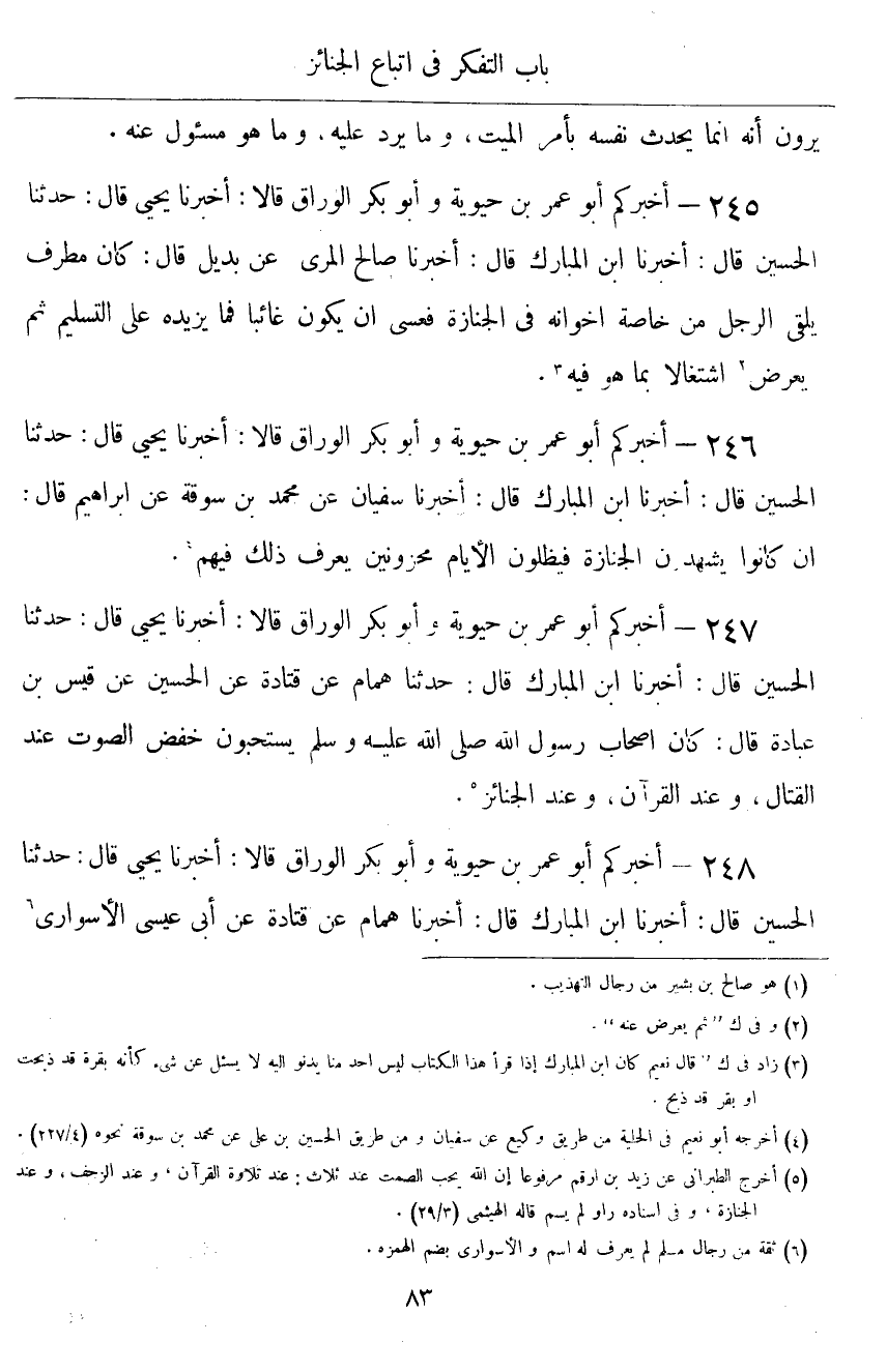 ٢٤٥ - أَخْبَرَكُمْ أَبُو عُمَرَ بْنُ حَيَوَيْهِ، وَأَبُو بَكْرٍ الْوَرَّاقُ قَالَا: أَخْبَرَنَا يَحْيَى قَالَ: حَدَّثَنَا الْحُسَيْنُ قَالَ: أَخْبَرَنَا ابْنُ الْمُبَارَكِ قَالَ: أَخْبَرَنَا صَالِحٌ الْمُرِّيُّ، عَنْ بُدَيْلٍ قَالَ: «كَانَ مُطَرِّفٌ يَلْقَى الرَّجُلَ مِنْ خَاصَّةِ إِخْوَانِهِ فِي الْجِنَازَةِ فَعَسَى أَنْ يَكُونَ غَائِبًا، فَمَا يَزِيدُهُ عَلَى التَّسْلِيمِ، ثُمَّ يُعْرِضُ عَنْهُ اشْتِغَالًا بِمَا هُوَ فِيهِ»