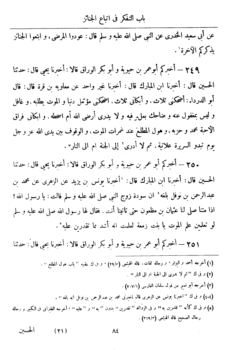 ٢٤٩ - أَخْبَرَكُمْ أَبُو عُمَرَ بْنُ حَيَوَيْهِ، وَأَبُو بَكْرٍ الْوَرَّاقُ قَالَا: أَخْبَرَنَا يَحْيَى قَالَ: حَدَّثَنَا الْحُسَيْنُ قَالَ: أَخْبَرَنَا ابْنُ الْمُبَارَكِ قَالَ: أَخْبَرَنَا غَيْرُ وَاحِدٍ عَنْ مُعَاوِيَةَ بْنِ قُرَّةَ قَالَ: قَالَ أَبُو الدَّرْدَاءِ: " أَضْحَكَنِي ثَلَاثٌ، وَأَبْكَانِي ثَلَاثٌ: أَضْحَكَنِي مُؤَمِّلُ دُنْيَا وَالْمَوْتُ يَطْلُبُهُ، وَغَافِلٌ وَلَيْسَ بِمَغْفُولٍ عَنْهُ، وَضَاحِكٌ بِمِلْءِ فِيهِ، وَلَا يَدْرِي، أَرْضَى اللَّهَ أُمْ أَسْخَطَهُ؟ وَأَبْكَانِي فِرَاقُ الْأَحِبَّةِ، مُحَمَّدٍ وَحِزْبِهِ، وَهَوْلُ الْمَطْلَعِ عِنْدَ غَمَرَاتِ الْمَوْتِ، وَالْوُقُوفُ بَيْنَ يَدَيِ اللَّهِ عَزَّ وَجَلَّ يَوْمَ تَبْدُوَ السَّرِيرَةُ عَلَانِيَةً، ثُمَّ لَا أَدْرِي إِلَى الْجَنَّةِ أَمْ إِلَى النَّارِ؟ "