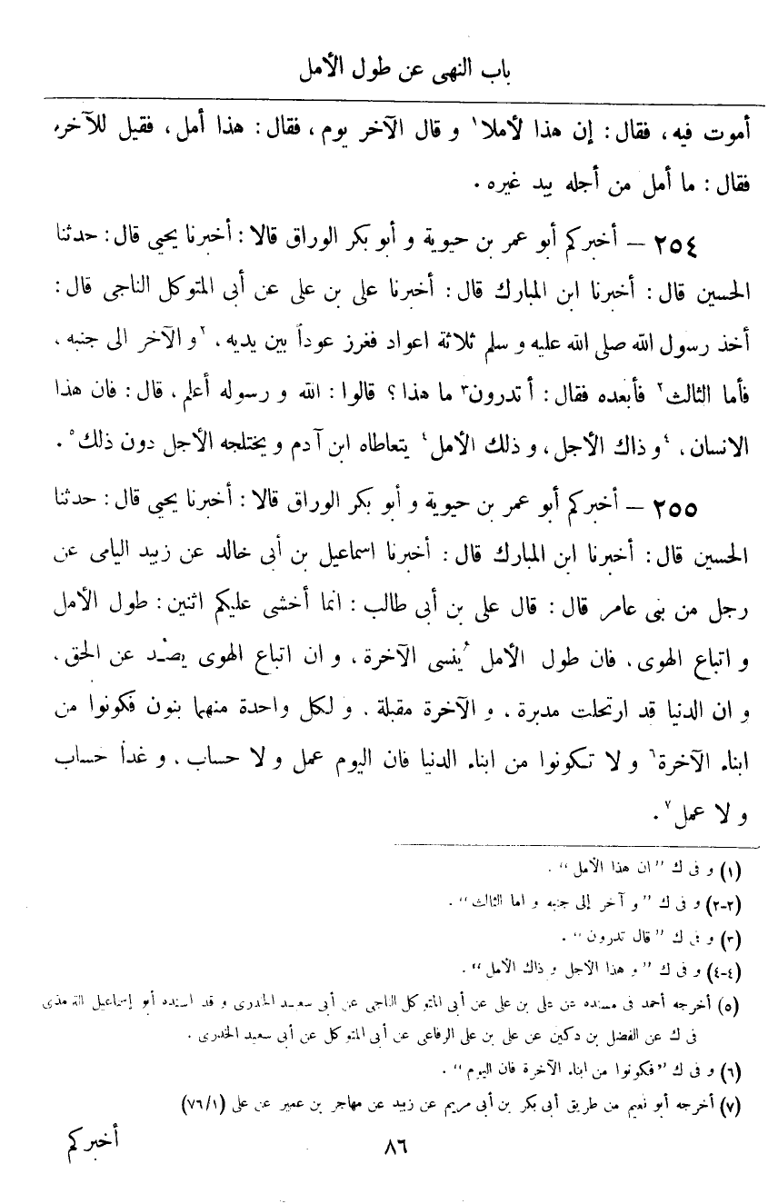 ٢٥٥ - أَخْبَرَكُمْ أَبُو عُمَرَ بْنُ حَيَوَيْهِ، وَأَبُو بَكْرٍ الْوَرَّاقُ قَالَا: أَخْبَرَنَا يَحْيَى قَالَ: حَدَّثَنَا الْحُسَيْنُ قَالَ: أَخْبَرَنَا ابْنُ الْمُبَارَكِ قَالَ: أَخْبَرَنَا إِسْمَاعِيلُ بْنُ أَبِي خَالِدٍ، عَنْ زُبَيْدٍ الْيَامِيِّ، عَنْ رَجُلٍ مِنْ بَنِي عَامِرٍ، قَالَ: قَالَ عَلِيُّ بْنُ أَبِي طَالِبٍ: " إِنَّمَا أَخْشَى عَلَيْكُمُ اثْنَيْنِ: طُولَ الْأَمَلِ، وَاتِّبَاعَ الْهَوَى، فَإِنَّ طُولَ الْأَمَلِ يُنْسِي الْآخِرَةَ، وَإِنَّ اتِّبَاعَ الْهَوَى يَصُدُّ عَنِ الْحَقِّ، وَإِنَّ الدُّنْيَا قَدِ ارْتَحَلَتْ مُدْبِرَةً، وَالْآخِرَةُ مُقْبِلَةٌ، وَلِكُلِّ وَاحِدَةٍ مِنْهُمَا بَنُونَ، فَكُونُوا مِنْ أَبْنَاءِ الْآخِرَةِ، وَلَا تَكُونُوا مِنْ أَبْنَاءِ الدُّنْيَا، فَإِنَّ الْيَوْمَ عَمَلٌ وَلَا حِسَابٌ، وَغَدًا حِسَابٌ وَلَا عَمَلٌ "