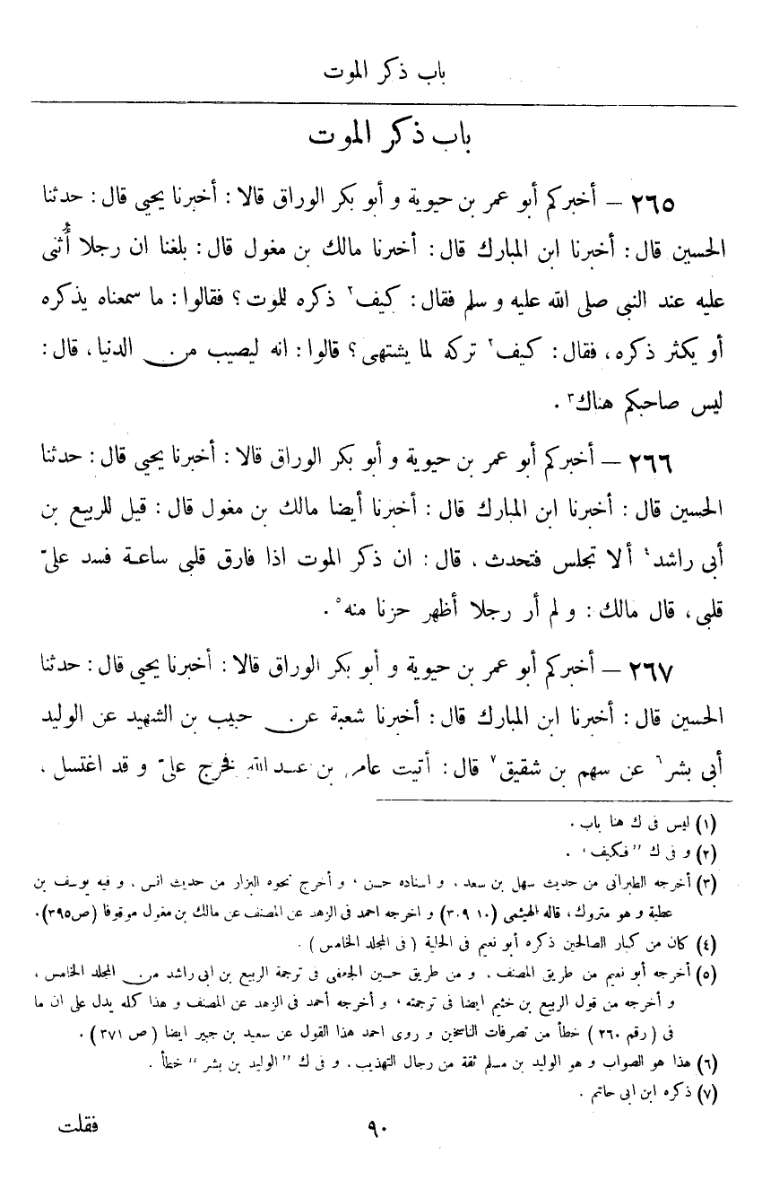 أَخْبَرَكُمْ أَبُو عُمَرَ بْنُ حَيَوَيْهِ، وَأَبُو بَكْرٍ الْوَرَّاقُ قَالَا: أَخْبَرَنَا يَحْيَى قَالَ: حَدَّثَنَا الْحُسَيْنُ قَالَ: أَخْبَرَنَا ابْنُ الْمُبَارَكِ قَالَ: أَخْبَرَنَا مَالِكُ بْنُ مِغْوَلٍ قَالَ: بَلَغَنَا أَنَّ رَجُلًا أُثْنِيَ عَلَيْهِ عِنْدَ النَّبِيِّ صَلَّى اللهُ عَلَيْهِ وَسَلَّمَ، فَقَالَ: «كَيْفَ ذِكْرُهُ لِلْمَوْتِ؟» فَقَالُوا: مَا سَمِعْنَاهُ يَذْكُرُهُ - أَوْ يُكْثِرُ ذِكْرَهُ - فَقَالَ: «كَيْفَ تَرْكُهُ لِمَا يَشْتَهِي؟» قَالُوا: إِنَّهُ لَيُصِيبُ مِنَ الدُّنْيَا، قَالَ: «لَيْسَ صَاحِبُكُمْ هُنَاكَ»