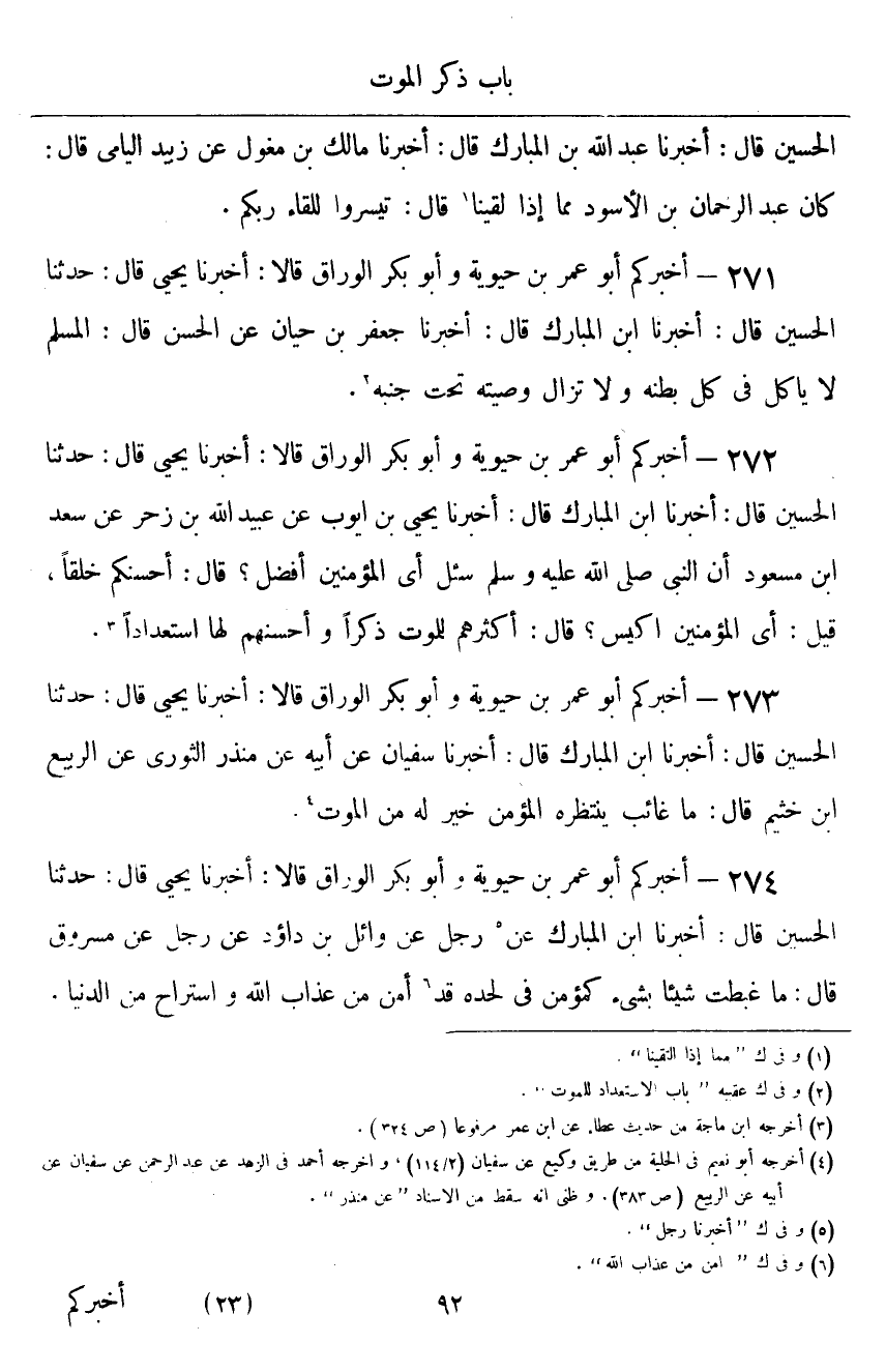 ٢٧٣ - أَخْبَرَكُمْ أَبُو عُمَرَ بْنُ حَيَوَيْهِ، وَأَبُو بَكْرٍ الْوَرَّاقُ قَالَا: أَخْبَرَنَا يَحْيَى قَالَ: حَدَّثَنَا الْحُسَيْنُ قَالَ: أَخْبَرَنَا ابْنُ الْمُبَارَكِ قَالَ: أَخْبَرَنَا سُفْيَانُ، عَنْ أَبِيهِ، عَنْ مُنْذِرٍ الثَّوْرِيِّ، عَنْ الرَّبِيعِ بْنِ خُثَيْمٍ قَالَ: «مَا غَائِبٌ يَنْتَظِرُهُ الْمُؤْمِنُ خَيْرٌ لَهُ مِنَ الْمَوْتِ»