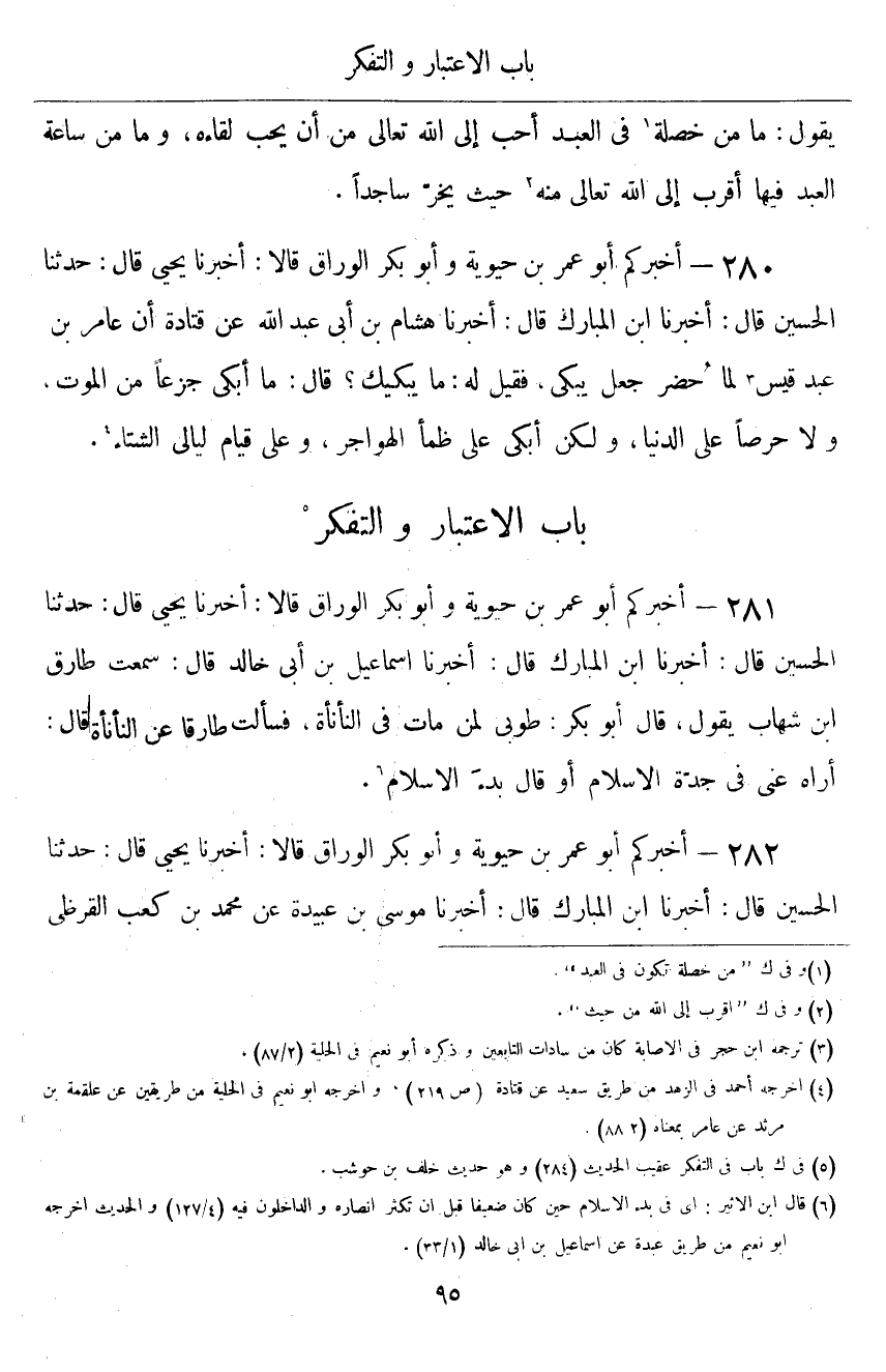 ٢٨٠ - أَخْبَرَكُمْ أَبُو عُمَرَ بْنُ حَيَوَيْهِ، وَأَبُو بَكْرٍ الْوَرَّاقُ قَالَا: أَخْبَرَنَا يَحْيَى قَالَ: حَدَّثَنَا الْحُسَيْنُ قَالَ: أَخْبَرَنَا ابْنُ الْمُبَارَكِ قَالَ: أَخْبَرَنَا هِشَامُ بْنُ أَبِي عَبْدِ اللَّهِ، عَنْ قَتَادَةَ، أَنَّ عَامِرَ بْنَ عَبْدِ قَيْسٍ، لَمَّا حُضِرَ جَعَلَ يَبْكِي، فَقِيلَ لَهُ: مَا يُبْكِيكَ؟ قَالَ: «مَا أَبْكِي جَزَعًا مِنَ الْمَوْتِ، وَلَا حِرْصًا عَلَى الدُّنْيَا، وَلَكِنْ أَبْكِي عَلَى ظَمَأِ الْهَوَاجِرِ، وَعَلَى قِيَامِ لَيَالِي الشِّتَاءِ»