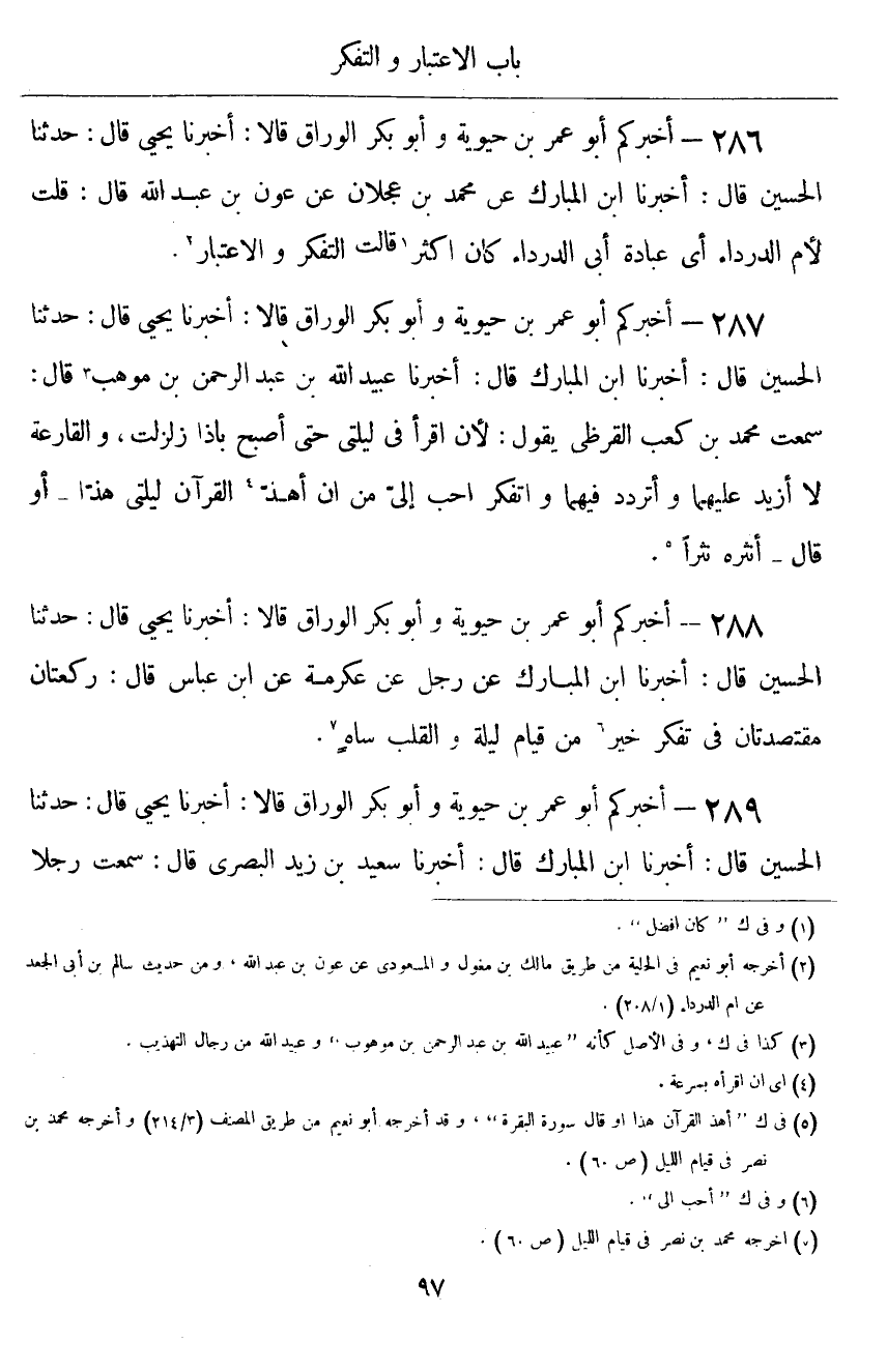 ٢٨٨ - أَخْبَرَكُمْ أَبُو عُمَرَ بْنُ حَيَوَيْهِ، وَأَبُو بَكْرٍ الْوَرَّاقُ قَالَا: أَخْبَرَنَا يَحْيَى قَالَ: حَدَّثَنَا الْحُسَيْنُ قَالَ: أَخْبَرَنَا ابْنُ الْمُبَارَكِ، عَنْ رَجُلٍ، عَنْ عِكْرِمَةَ، عَنِ ابْنِ عَبَّاسٍ قَالَ: «رَكْعَتَانِ مُقْتَصِدَتَانِ فِي تَفَكُّرٍ، خَيْرٌ مِنْ قِيَامِ لَيْلَةٍ وَالْقَلْبُ سَاهٍ»