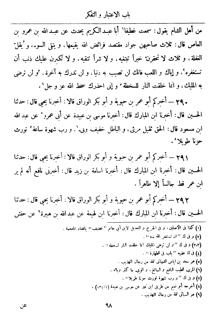 ٢٩١ - أَخْبَرَكُمْ أَبُو عُمَرَ بْنُ حَيَوَيْهِ، وَأَبُو بَكْرٍ الْوَرَّاقُ قَالَا: أَخْبَرَنَا يَحْيَى قَالَ: حَدَّثَنَا الْحُسَيْنُ قَالَ: أَخْبَرَنَا ابْنُ الْمُبَارَكِ قَالَ: أَخْبَرَنَا أُسَامَةُ بْنُ زَيْدٍ قَالَ: أَخْبَرَنِي نَافِعٌ: «أَنَّهُ لَمْ يَرَ ابْنَ عُمَرَ قَطُّ جَالِسًا إِلَّا طَاهِرًا»