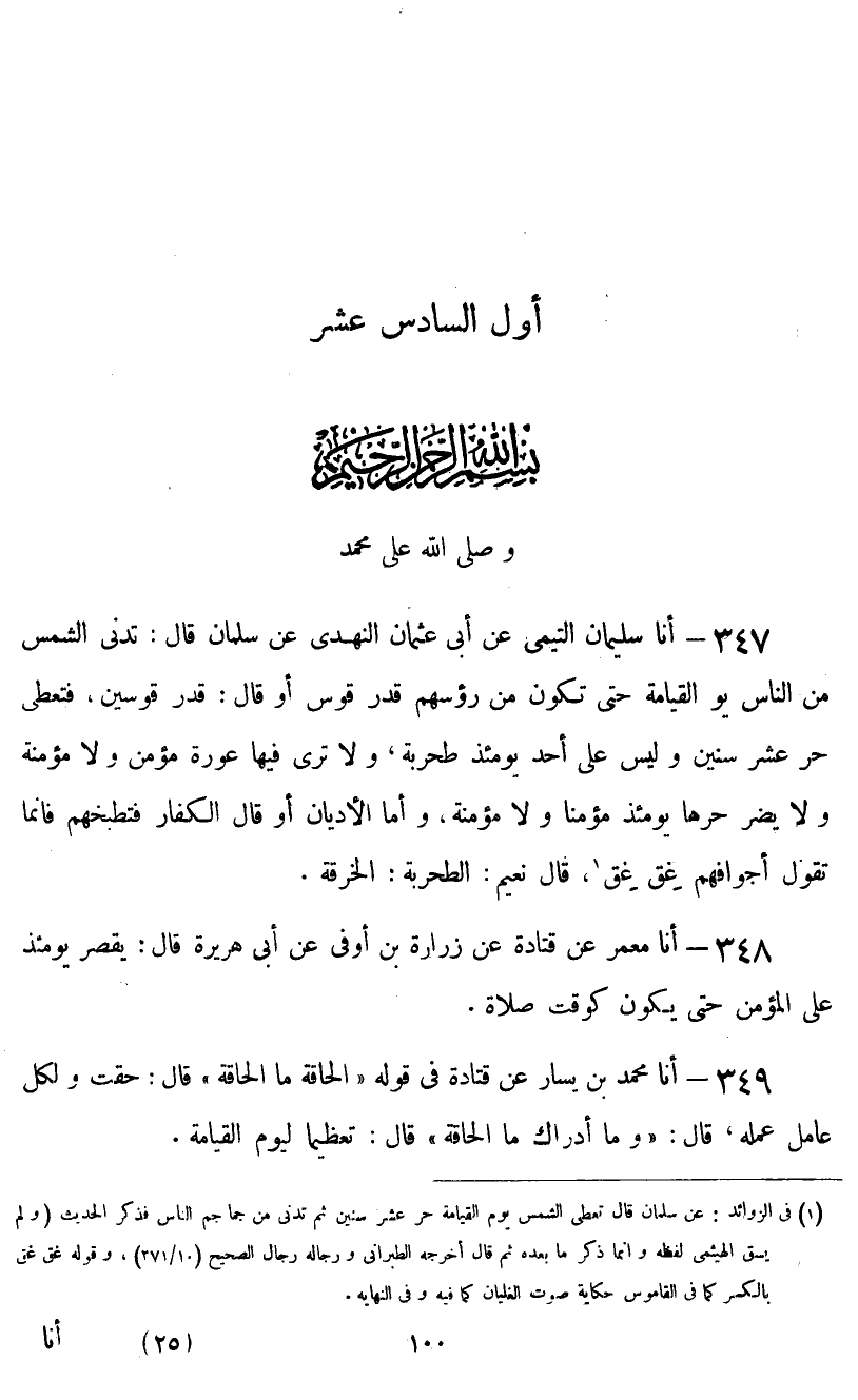 أنا سُلَيْمَانُ التَّيْمِيُّ، عَنْ أَبِي عُثْمَانَ النَّهْدِيِّ، عَنْ سَلْمَانَ قَالَ: " تُدْنَى الشَّمْسُ مِنَ النَّاسِ يَوْمَ الْقِيَامَةِ حَتَّى تَكُونَ مِنْ رُءُوسِهِمْ قَدْرَ قَوْسٍ - أَوْ قَالَ: قَدْرَ قَوْسَيْنِ - فَتُعْطَى حَرَّ عَشْرِ سِنِينَ، وَلَيْسَ عَلَى أَحَدٍ يَوْمَئِذٍ طَحْرَبَةٌ، وَلَا تُرَى فِيهَا عَوْرَةُ مُؤْمِنٍ، وَلَا مُؤْمِنَةٍ، وَلَا يَضُرُّ حَرُّهَا يَوْمَئِذٍ مُؤْمِنًا وَلَا مُؤْمِنَةً، وَأَمَّا الْأَدْيَانُ - أَوْ قَالَ: الْكُفَّارُ - فَتَطْبُخُهُمْ، فَإِنَّمَا تَقُولُ: أَجْوَافُهُمْ: غِقْ غِقْ " قَالَ نُعَيْمٌ: الطَحْرَبَةُ: الْخِرْقَةُ
