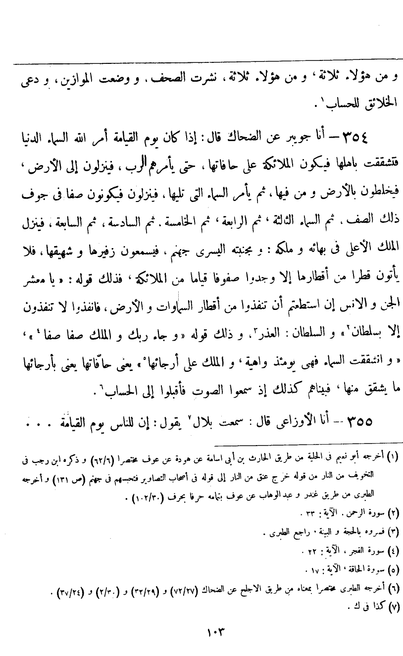أَنَا جُوَيْبِرٌ، عَنِ الضَّحَّاكِ قَالَ: " إِذَا كَانَ يَوْمُ الْقِيَامَةِ أَمَرَ اللَّهُ السَّمَاءَ الدُّنْيَا فَتَشقَّقَتْ بِأَهْلِهَا، فَيَكُونُ الْمَلَائِكَةُ عَلَى حَافَّاتِهَا حَتَّى يَأْمُرَهُمُ الرَّبُّ فَيَنْزِلُونَ إِلَى الْأَرْضِ، فَيُخْلَطُونَ بِالْأَرْضِ وَمَنْ فِيهَا، ثُمَّ يَأْمُرُ السَّمَاءَ الَّتِي تَلِيهَا فَيَنْزِلُونَ فَيَكُونُونَ صَفًّا فِي جَوْفِ ذَلِكَ الصَّفِّ، ثُمَّ السَّمَاءَ الثَّالِثَةَ، ثُمَّ الرَّابِعَةَ، ثُمَّ الْخَامِسَةَ، ثُمَّ السَّادِسَةَ، ثُمَّ السَّابِعَةَ، فَيَنْزِلُ الْمَلِكُ الْأَعْلَى فِي بَهَائِهِ وَمُلْكِهِ، وَمَجْنَبَتُهُ الْيُسْرَى جَهَنَّمُ، فَيَسْمَعُونَ زَفِيرَهَا وَشَهِيقَهَا، فَلَا يَأْتُونَ قُطْرًا مِنْ أَقْطَارِهَا إِلَّا وَجَدُوا صُفُوفًا قِيَامًا مِنَ الْمَلَائِكَةِ، فَذَلِكَ قَوْلُهُ: {يَا مَعْشَرَ الْجِنِّ وَالْإِنْسِ إِنِ اسْتَطَعْتُمْ أَنْ تَنْفُذُوا مِنْ أَقْطَارِ السَّمَوَاتِ وَالْأَرْضِ فَانْفُذُوا لَا تَنْفُذُونَ إِلَّا بِسُلْطَانٍ} وَالسُّلْطَانُ: الْعُذْرُ، وَذَلِكَ قَوْلُهُ: {وَجَاءَ رَبُّكَ وَالْمَلَكُ صَفًّا صَفًّا} [الفجر: ٢٢] {وَانْشَقَّتِ السَّمَاءُ فَهِيَ يَوْمَئِذٍ وَاهِيَةٌ وَالْمَلَكُ عَلَى أَرْجَائِهَا} [الحاقة: ١٧] يَعْنِي حَافَّاتِهَا، يَعْنِي بِأَرْجَائِهَا مَا يَشَقَّقُ مِنْهَا، فَبَيْنَا هُمْ كَذَلِكَ إِذْ سَمِعُوا الصَّوْتَ فَأَقْبَلُوا إِلَى الْحِسَابِ "