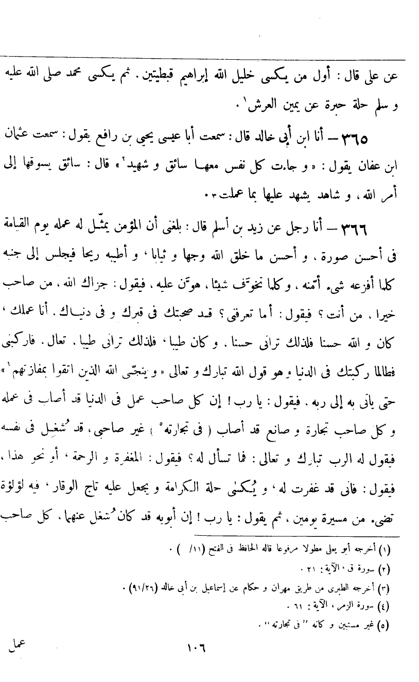 أنا رَجُلٌ، عَنْ زَيْدِ بْنِ أَسْلَمَ قَالَ: بَلَغَنِي " أَنَّ الْمُؤْمِنَ يُمَثَّلُ لَهُ عَمَلُهُ يَوْمَ الْقِيَامَةِ فِي أَحْسَنِ صُورَةٍ، وَأَحْسَنِ مَا خَلَقَ اللَّهُ وَجْهًا وَثِيَابًا، وَأَطْيَبِهِ رِيحًا، فَيَجْلِسُ إِلَى جَنْبِهِ، كُلَّمَا أَفْزَعَهُ شَيْءٌ أَمَّنَهُ، وَكُلَّمَا تَخَوَّفَ شَيْئًا هَوَّنَ عَلَيْهِ، فَيَقُولُ: جَزَاكَ اللَّهُ مِنْ صَاحِبٍ خَيْرًا، مَنْ أَنْتَ؟ فَيَقُولُ: أَمَا تَعْرِفُنِي؟ قَدْ صَحِبْتُكَ فِي قَبْرِكَ، وَفِي دُنْيَاكَ، أَنَا عَمَلُكَ، كَانَ وَاللَّهِ حَسَنًا؛ فَلِذَلِكَ تَرَانِي حَسَنًا، وَكَانَ طَيِّبًا؛ فَلِذَلِكَ تَرَانِي طَيِّبًا، تَعَالَ فَارْكَبْنِي، فَطَالَمَا رَكِبْتُكَ فِي الدُّنْيَا، وَهُوَ قَوْلُ اللَّهِ تَبَارَكَ وَتَعَالَى: {وَيُنَجِّي اللَّهُ الَّذِينَ اتَّقَوْا بِمَفَازَتِهِمْ} [الزمر: ٦١] حَتَّى يَأْتِيَ بِهِ إِلَى رَبِّهِ، فَيَقُولُ: يَا رَبِّ، إِنَّ كُلَّ صَاحِبِ عَمَلٍ فِي الدُّنْيَا قَدْ أَصَابَ فِي عَمَلِهِ، وَكُلَّ صَاحِبِ تِجَارَةٍ وَصَانِعٍ قَدْ أَصَابَ فِي تِجَارَتِهِ، غَيْرَ صَاحِبِي قَدْ شُغِلَ فِي نَفْسِهِ، فَيَقُولُ لَهُ الرَّبُّ تَبَارَكَ وَتَعَالَى: فَمَا تَسْأَلُ لَهُ، فَيَقُولُ: الْمَغْفِرَةَ وَالرَّحْمَةَ، أَوْ نَحْوَ هَذَا، فَيَقُولُ: فَإِنِّي قَدْ غَفَرْتُ لَهُ، وَيُكْسَى حُلَّةَ الْكَرَامَةِ، وَيُجْعَلُ عَلَيْهِ تَاجُ الْوَقَارِ، فِيهِ لُؤْلُؤَةٌ تُضِيءُ مِنْ مَسِيرَةِ يَوْمَيْنِ، ثُمَّ يَقُولُ: يَا رَبِّ، إِنَّ أَبَوَيْهِ قَدْ كَانَ شُغِلَ عَنْهُمَا كُلُّ صَاحِبِ ⦗١٠٧⦘ عَمَلٍ وَتِجَارَةٍ، قَدْ كَانَ يُدْخِلُ عَلَى أَبَوَيْهِ مِنْ عَمَلِهِ فَيُعْطَيَانِ مِثْلَ مَا أُعْطِيَ، وَيَتَمَثَّلُ لِلْكَافِرِ عَمَلُهُ فِي صُورَةِ أَقْبَحِ مَا خَلَقَ اللَّهُ وَجْهًا، وَأنْتَنِهِ رِيحًا، فَيَجْلِسُ إِلَى جَنْبِهِ، كُلَّمَا أَفْزَعَهُ شَيْءٌ زَادَهُ فَزَعًا، وَكُلَّمَا تَخَوَّفَ شَيْئًا زَادَهُ خَوْفًا، فَيَقُولُ: بِئْسَ الصَّاحِبُ أَنْتَ، وَمَنْ أَنْتَ؟ فَيَقُولُ: أَمَا تَعْرِفُنِي، فَيَقُولُ: لَا، فَيَقُولُ: أَنَا عَمَلُكَ، كَانَ قَبِيحًا؛ فَلِذَلِكَ تَرَانِي قَبِيحًا، وَكَانَ مُنْتِنًا؛ فَلِذَلِكَ تَرَانِي مُنْتِنًا، فَطَأْطِئْ رَأْسَكَ أَرْكَبْكَ، فَطَالَمَا رَكِبْتَنِي فِي الدُّنْيَا، فَيَركَبُهُ، وَهُوَ قَوْلُهُ: {لِيَحْمِلُوا أَوْزَارَهُمْ كَامِلَةً يَوْمَ الْقِيَامَةِ} [النحل: ٢٥] "