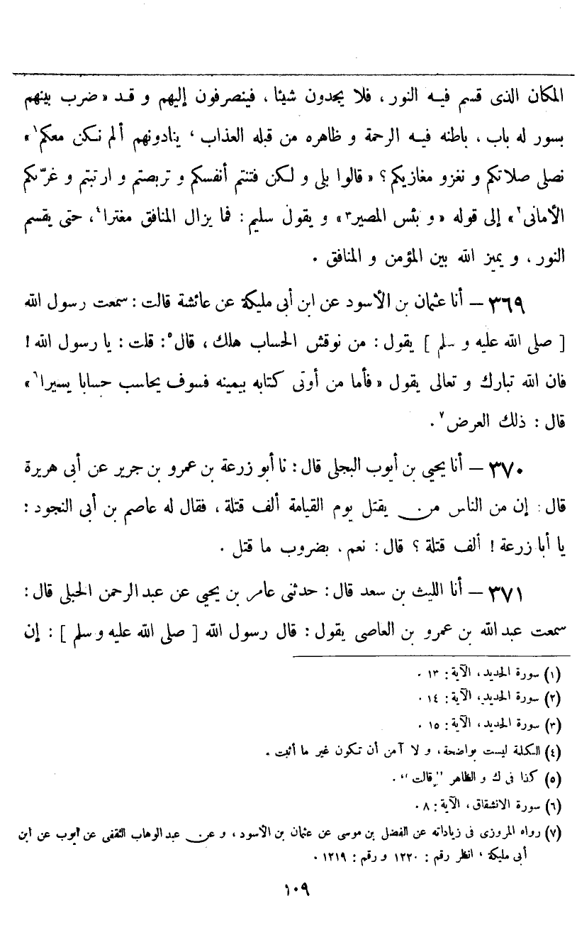 أنا يَحْيَى بْنُ أَيُّوبَ الْبَجَلِيُّ قَالَ: نا أَبُو زُرْعَةَ بْنُ عَمْرِو بْنِ جَرِيرٍ، عَنْ أَبِي هُرَيْرَةَ قَالَ: «إِنَّ مِنَ النَّاسِ مَنْ يُقْتَلُ يَوْمَ الْقِيَامَةِ أَلْفَ قَتْلَةٍ» ، فَقَالَ لَهُ عَاصِمُ بْنُ أَبِي النَّجُودِ: يَا أَبَا زُرْعَةَ، أَلْفَ قَتْلَةٍ؟ قَالَ: «نَعَمْ، بِضُرُوبِ مَا قَتَلَ»