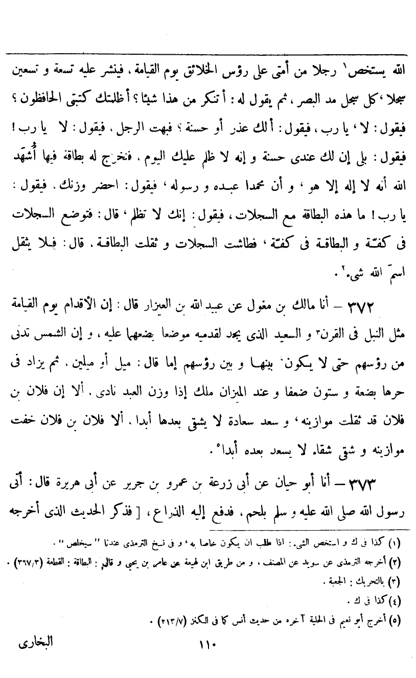 أنا مَالِكُ بْنُ مِغْوَلٍ، عَنْ عُبَيْدِ اللَّهِ بْنِ الْعَيْزَارِ قَالَ: " إِنَّ الْأَقْدَامَ يَوْمَ الْقِيَامَةِ مِثْلُ النَّبْلِ فِي الْقَرَنِ، وَالسَّعِيدُ الَّذِي يَجِدُ لِقَدَمَيْهِ مَوْضِعًا يَضَعُهُمَا عَلَيْهِ، وَإِنَّ الشَّمْسَ تُدْنَى مِنْ رُءُوسِهِمْ حَتَّى لَا يَكُونَ بَيْنَهَا وَبَيْنَ رُءُوسِهِمْ، إِمَّا قَالَ: مِيلٌ، أَوْ مِيلَيْنِ، ثُمَّ يُزَادُ فِي حَرِّهَا بِضْعَةً وَسُتُّونَ ضِعْفًا، وَعِنْدَ الْمِيزَانِ مَلَكٌ إِذَا وُزِنَ الْعَبْدُ نَادَى: أَلَا إِنَّ فُلَانَ ابْنَ فُلَانٍ قَدْ ثَقُلَتْ مَوَازِينُهُ، وَسَعِدَ سَعَادَةً لَا يَشْقَى بَعْدَهَا أَبَدًا، إِلَّا فُلَانَ ابْنَ فُلَانٍ خَفَّتْ مَوَازِينُهُ، وَشَقِيَ شَقَاءً لَا يَسعَدُ بَعْدَهُ أَبَدًا "