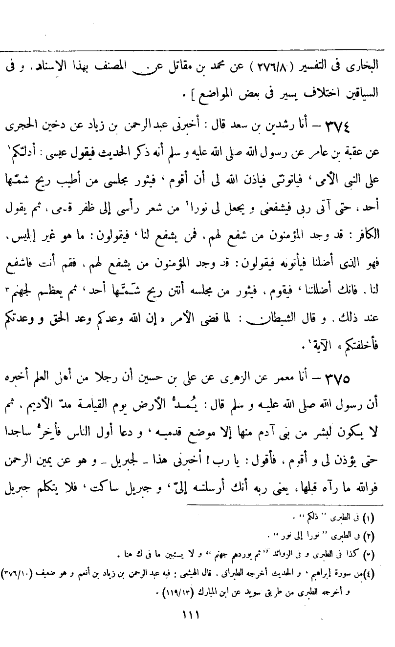 أنا رِشْدِينُ بْنُ سَعْدٍ قَالَ: أَخْبَرَنِي عَبْدُ الرَّحْمَنِ بْنُ زِيَادٍ، عَنْ دُخَيْنٍ الْحَجْرِيِّ، عَنْ عُقْبَةَ بْنِ عَامِرٍ، عَنْ رَسُولِ اللَّهِ صَلَّى اللهُ عَلَيْهِ وَسَلَّمَ أَنَّهُ ذَكَرَ الْحَدِيثَ: " فَيَقُولُ عِيسَى: أَدُلُّكُمْ عَلَى النَّبِيِّ الْأُمِّيِّ، فَيَأْتُونَ، فَيَأْذَنُ اللَّهُ لِي أَنْ أَقُومَ، فَيَثُورُ مَجْلِسِي مِنْ أَطْيَبِ رِيحٍ شَمَّهَا أَحَدٌ حَتَّى آتِيَ رَبِّي، فَيُشَفِّعَنِي، وَيَجْعَلُ لِي نُورًا مِنْ شَعْرِ رَأْسِي إِلَى ظُفُرِ قَدَمَيَّ، ثُمَّ يَقُولُ الْكَافِرُ: قَدْ وَجَدَ الْمُؤْمِنُونَ مَنْ شَفَعَ لَهُمْ، فَمَنْ يَشْفَعُ لَنَا؟ فَيَقُولُونَ: مَا هُوَ غَيْرُ إِبْلِيسَ، فَهُوَ الَّذِي أَضَلَّنَا، فَيَأْتُونَهُ، فَيَقُولُونَ قَدْ وَجَدَ الْمُؤْمِنُونَ مَنْ يَشْفَعُ لَهُمْ، فَقُمْ أَنْتَ فَاشْفَعْ لَنَا، فَإِنَّكَ أَضْلَلْتَنَا، فَيَقُومُ فَيَثُورُ مِنْ مَجْلِسِهِ أَنْتَنُ رِيحٍ شَمَّهَا أَحَدٌ، ثُمَّ يَعْظُمُ لِجَهَنَّمَ عِنْدَ ذَلِكَ، {وَقَالَ الشَّيْطَانُ لَمَّا قُضِيَ الْأَمْرُ إِنَّ اللَّهَ وَعَدَكُمْ وَعْدَ الْحَقِّ وَوَعَدْتُكُمْ فَأَخْلَفْتُكُمْ} [إبراهيم: ٢٢] الْآيَةَ "