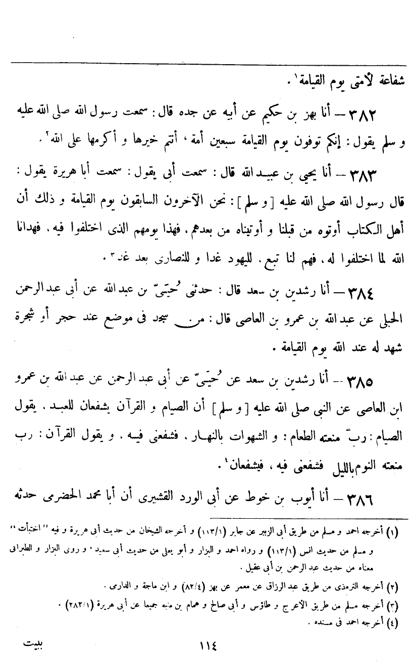 أنا بَهْزُ بْنُ حَكِيمٍ، عَنْ أَبِيهِ، عَنْ جَدِّهِ قَالَ: سَمِعْتُ رَسُولَ اللَّهِ صَلَّى اللهُ عَلَيْهِ وَسَلَّمَ يَقُولُ: «إِنَّكُمْ تُوفُونَ يَوْمَ الْقِيَامَةِ سَبْعِينَ أُمَّةً، أَنْتُمْ خَيْرُهَا، وَأَكْرَمُهَا عَلَى اللَّهِ»