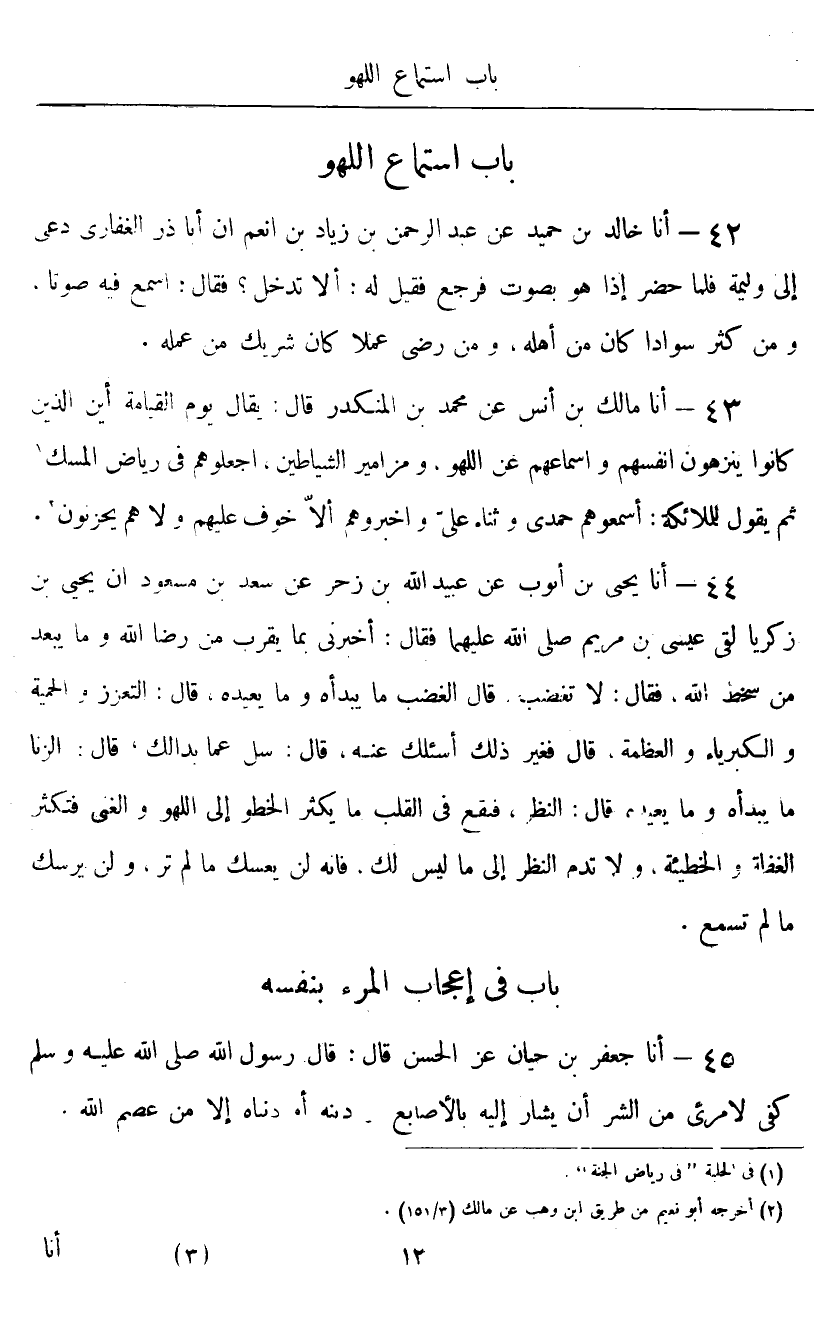 أنا مَالِكُ بْنُ أَنَسٍ، عَنْ مُحَمَّدِ بْنِ الْمُنْكَدِرِ قَالَ: " يُقَالُ يَوْمَ الْقِيَامَةِ: أَيْنَ الَّذِينَ كَانُوا يُنَزِّهُونَ أَنْفُسَهَمْ وَأَسْمَاعَهُمْ عَنِ اللَّهْوِ، وَمَزَامِيرِ الشَّيَاطِينِ؟ اجعلُوهُمْ فِي رِيَاضِ الْمِسْكِ، ثُمَّ يَقُولُ لِلْمَلَائِكَةِ: أَسْمِعُوهُمْ حَمْدِي وَثَنَاءً عَلَيَّ، وَأَخْبِرُوهُمْ أَلَّا خَوْفٌ عَلَيْهِمْ وَلَا هُمْ يَحْزَنُونَ "