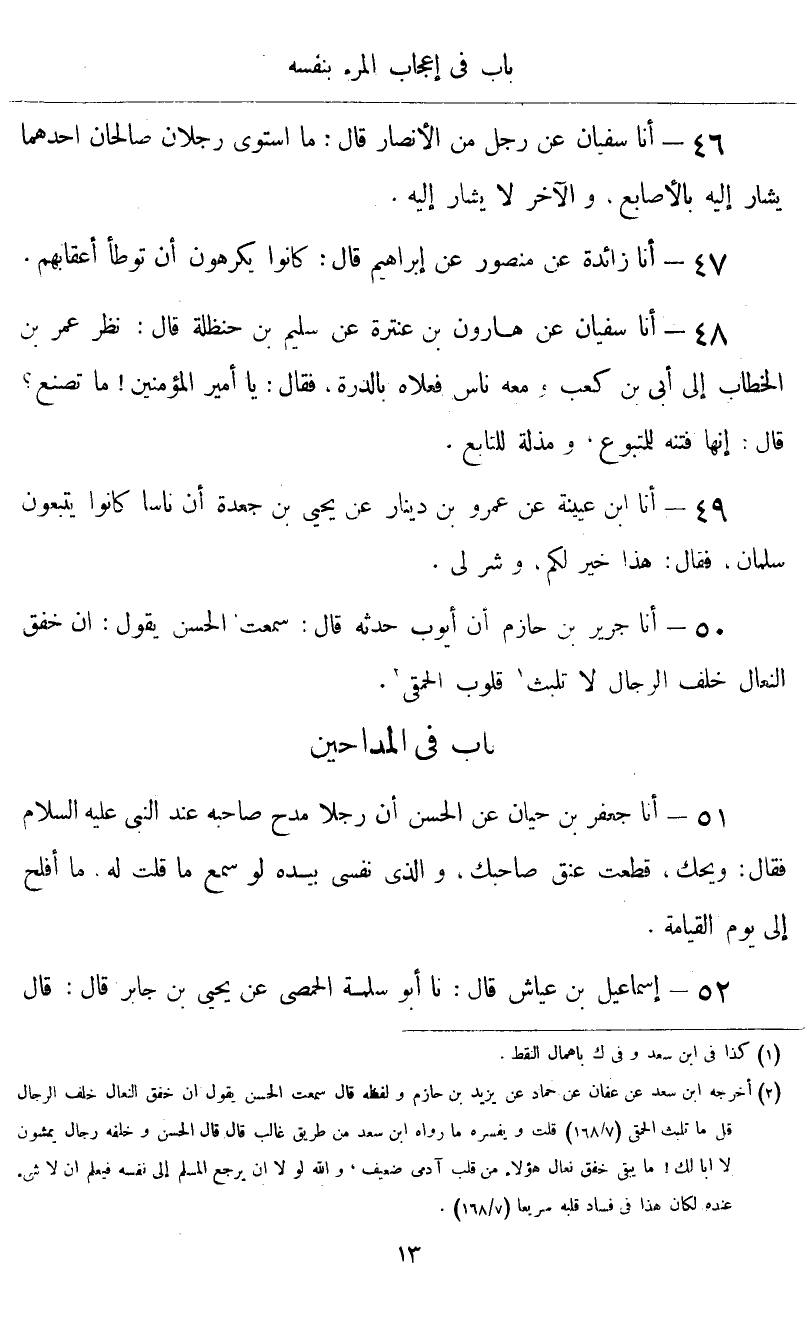 أنا جَعْفَرُ بْنُ حَيَّانَ، عَنِ الْحَسَنِ، أَنَّ رَجُلًا مَدَحَ صَاحِبَهُ عِنْدَ النَّبِيِّ صَلَّى اللهُ عَلَيْهِ وَسَلَّمَ فَقَالَ: «وَيْحَكَ قَطَعْتَ عُنُقَ صَاحِبِكَ، وَالَّذِي نَفْسِي بِيَدِهِ لَوْ سَمِعَ مَا قُلْتَ لَهُ مَا أَفْلَحَ إِلَى يَوْمِ الْقِيَامَةِ»