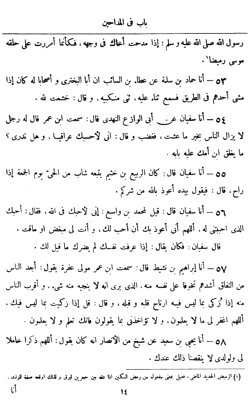 أنا سُفْيَانُ قَالَ: كَانَ الرَّبِيعُ بْنُ خُثَيْمٍ، يَتْبَعُهُ شَابٌّ مِنَ الْحَيِّ يَوْمَ الْجُمُعَةِ إِذْ رَاحَ قَالَ: فَيَقُولُ بِيَدِهِ: «أَعُوذُ بِاللَّهِ مِنْ شَرِّكُمْ»