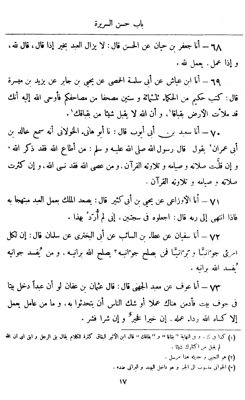 أنا جَعْفَرُ بْنُ حَيَّانَ، عَنِ الْحَسَنِ قَالَ: «لَا يَزَالُ الْعَبْدُ بِخَيْرٍ إِذَا قَالَ , قَالَ لِلَّهِ، وَإِذَا عَمِلَ، يَعْمَلُ لِلَّهِ»