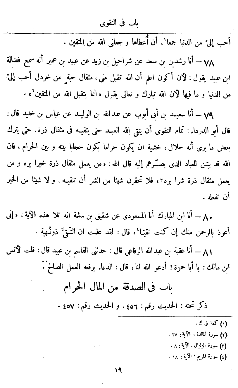 أنا ابْنُ الْمُبَارَكِ، أنا الْمَسْعُودِيُّ، عَنْ شَقِيقِ بْنِ سَلَمَةَ، أَنَّهُ تَلَا هَذِهِ الْآيَةَ {إِنِّي أَعُوذُ بِالرَّحْمَنِ مِنْكَ إِنْ كُنْتَ تَقِيًّا} [مريم: ١٨] قَالَ: «لَقَدْ عَلِمَتْ أَنَّ التَّقِيَّ ذُو نُهْيَةٍ»
