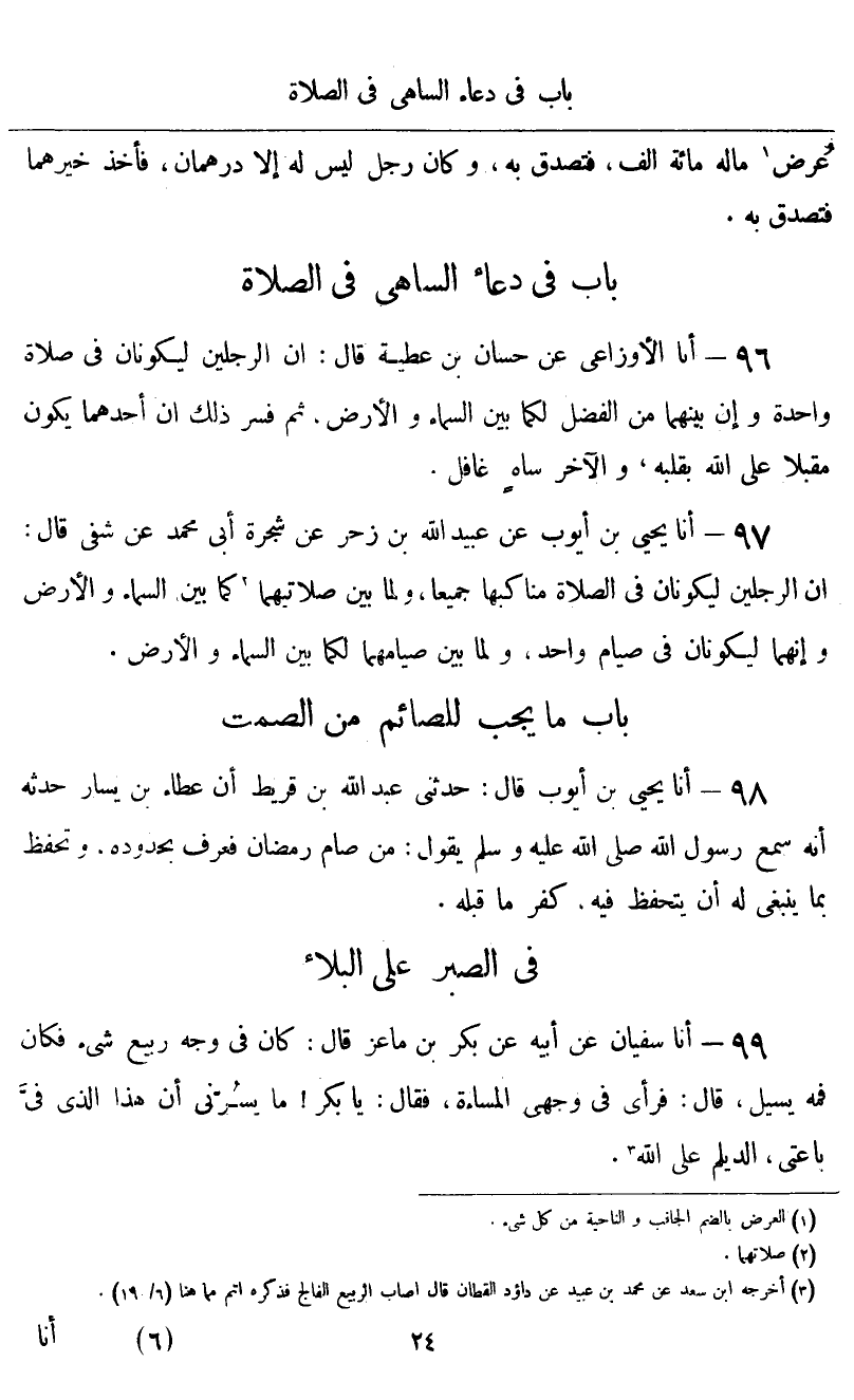 أنا الْأَوْزَاعِيُّ، عَنْ حَسَّانِ بْنِ عَطِيَّةَ قَالَ: «إِنَّ الرَّجُلَيْنِ لَيَكُونَانِ فِي صَلَاةٍ وَاحِدَةٍ، وَإِنَّ بَيْنَهُمَا مِنَ الْفَضْلِ لَكَمَا بَيْنَ السَّمَاءِ وَالْأَرْضِ» ثُمَّ فَسَّرَ ذَلِكَ «أَنَّ أَحَدَهُمَا يَكُونُ مُقْبِلًا عَلَى اللَّهِ بِقَلْبِهِ، وَالْآخَرَ سَاهٍ غَافِلٌ»