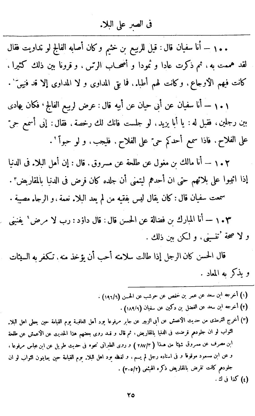 أنا سُفْيَانُ قَالَ: قِيلَ لِلرَّبِيعِ بْنِ خُثَيْمٍ، وَكَانَ أَصَابَهُ الْفَالِجُ: لَوْ تدَاوَيْتَ فَقَالَ: «لَقَدْ هَمَمْتُ بِهِ، ثُمَّ ذَكَرْتُ عَادًا وَثَمُودَ، وَأَصْحَابَ الرَّسِّ، وَقُرُونًا بَيْنَ ذَلِكَ كَثِيرًا، كَانَتْ فِيهِمُ الْأَوْجَاعُ، وَكَانَتْ لَهُمْ أَطِبَّاءُ، فَمَا بَقِيَ الْمُدَاوِي وَلَا الْمُدَاوَى إِلَّا قَدْ فَنِيَ»