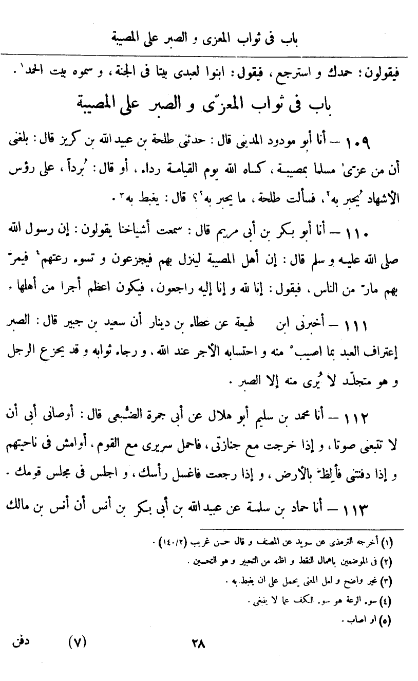 أنا أَبُو مَوْدُودٍ الْمَدِينِيُّ قَالَ: حَدَّثَنِي طَلْحَةُ بْنُ عُبَيْدِ اللَّهِ بْنِ كُرَيْزٍ قَالَ: «بَلَغَنِي أَنَّ مَنْ عَزَّى مُسْلِمًا بِمُصِيبَةٍ كَسَاهُ اللَّهُ يَوْمَ الْقِيَامَةِ رِدَاءً» أَوْ قَالَ: «بُرْدًا عَلَى رُءُوسِ الْأَشْهَادِ يُحْبَرُ بِهِ» فَسَأَلْتُ طَلْحَةَ، مَا يُحْبَرُ بِهِ؟ قَالَ: «يُغْبَطُ بِهِ»