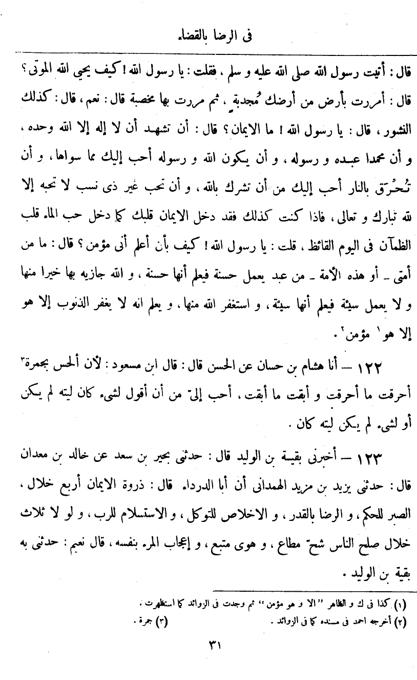 أَخْبَرَنِي بَقِيَّةُ بْنُ الْوَلِيدِ قَالَ: حَدَّثَنِي بَحِيرُ بْنُ سَعْدٍ، عَنْ خَالِدِ بْنِ مَعْدَانَ قَالَ: حَدَّثَنِي يَزِيدُ بْنُ مَرْثَدٍ الْهَمْدَانِيُّ، أَنَّ أَبَا الدَّرْدَاءِ قَالَ: " ذُرْوَةُ الْإِيمَانِ أَرْبَعُ خِلَالٍ: الصَّبْرُ لِلْحُكْمِ، وَالرِّضَا بِالْقَدَرِ، وَالْإِخْلَاصُ للتَّوكُّلِ، وَالِاسْتِسْلَامُ لِلرَّبِّ، وَلَوْلَا ثَلَاثُ خِلَالٍ صَلُحَ النَّاسُ: شُحٌّ مُطَاعٌ، وَهَوًىً مُتَّبَعٌ، وَإِعْجَابُ الْمَرْءِ بِنَفْسِهِ " قَالَ نُعَيْمٌ: حَدَّثَنِي بِهِ بَقِيَّةُ بْنُ الْوَلِيدِ