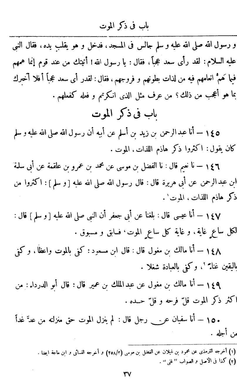 نا نُعَيْمٌ، قَالَ نا الْفَضْلُ بْنُ مُوسَى، عَنْ مُحَمَّدِ بْنِ عَمْرِو بْنِ عَلْقَمَةَ، عَنْ أَبِي سَلَمَةَ بْنِ عَبْدِ الرَّحْمَنِ، عَنْ أَبِي هُرَيْرَةَ قَالَ: قَالَ رَسُولُ اللَّهِ صَلَّى اللهُ عَلَيْهِ وَسَلَّمَ: «أَكْثِرُوا مِنْ ذِكْرِ هَاذِمِ اللَّذَاتِ الْمَوْتِ»