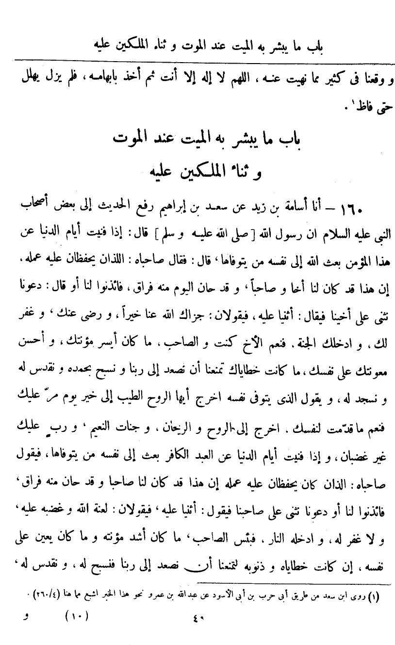 أنا أُسَامَةُ بْنُ زَيْدٍ، عَنْ سَعْدِ بْنِ إِبْرَاهِيمَ، رَفَعَ الْحَدِيثَ إِلَى بَعْضِ أَصْحَابِ النَّبِيِّ صَلَّى اللهُ عَلَيْهِ وَسَلَّمَ قَالَ: " إِذَا فَنِيَتْ أَيَّامُ الدُّنْيَا عَنْ هَذَا الْمُؤْمِنِ بَعَثَ اللَّهُ إِلَى نَفْسِهِ مَنْ يَتَوَفَّاهَا قَالَ: فَقَالَ صَاحِبَاهُ اللَّذَانِ يَحْفَظَانِ عَلَيْهِ عَمَلَهُ: إِنَّ هَذَا قَدْ كَانَ لَنَا أَخًا وَصَاحِبًا، وَقَدْ حَانَ الْيَوْمَ مِنْهُ الْفِرَاقُ، فَأْذَنُوا لَنَا، أَوْ قَالَ: دَعُونَا نُثْنِي عَلَى أَخِينَا، فَيُقَالُ: أَثْنِيَا عَلَيْهِ، فَيَقُولَانِ: جَزَاكَ اللَّهُ عَنَّا خَيْرًا، وَرَضِيَ عَنْكَ، وَغَفَرَ لَكَ، وَأَدْخَلَكَ الْجَنَّةَ، فَنِعْمَ الْأَخُ كُنْتَ وَالصَّاحِبُ، مَا كَانَ أَيْسَرَ مُؤْنَتَكَ، وَأَحْسَنَ مَعُونَتَكَ عَلَى نَفْسِكَ، مَا كَانَتْ خَطَايَاكَ تَمْنعُنَا أَنْ نَصْعَدَ إِلَى رَبِّنَا، وَنُسَبِّحَ بِحَمْدِهِ، وَنُقَدِّسَ لَهُ، وَنَسْجُدَ لَهُ، وَيَقُولُ الَّذِي يَتَوَفَّى نَفْسَهُ: اخْرُجْ أَيُّهَا الرُّوحُ الطَّيِّبُ إِلَى خَيْرِ يَوْمٍ مَرَّ عَلَيْكَ، فَنِعْمَ مَا قَدَّمْتَ لِنَفْسِكَ، اخْرُجْ إِلَى الرَّوْحِ وَالرَّيْحَانِ، وَجَنَّاتِ النَّعِيمِ، وَرَبٍّ عَلَيْكَ غَيْرِ غَضْبَانٍ، وَإِذَا فَنِيَتْ أَيَّامُ الدُّنْيَا عَنِ الْعَبْدِ الْكَافِرِ بَعَثَ إِلَى نَفْسِهِ مَنْ يَتَوَفَّاهَا، فَيَقُولُ صَاحِبَاهُ اللَّذَانِ كَانَا يَحْفَظَانِ عَلَيْهِ عَمَلَهُ: إِنَّ هَذَا قَدْ كَانَ لَنَا صَاحِبًا، وَقَدْ حَانَ مِنْهُ فِرَاقٌ فَأْذَنُوا لَنَا، أَوْ دَعُونَا، نُثْنِي عَلَى صَاحِبِنَا، فَيَقُولُ: أَثْنِيَا عَلَيْهِ، فَيَقُولَانِ: لَعْنَةُ اللَّهِ وَغَضَبُهُ عَلَيْهِ، وَلَا غَفَرَ لَهُ، وَأَدْخَلَهُ النَّارَ، فَبِئْسَ الصَّاحِبُ، مَا كَانَ أَشَدَّ مُؤْنَتَهُ، وَمَا كَانَ يُعِينُ عَلَى نَفْسِهِ، إِنْ كَانَتْ خَطَايَاهُ وَذُنُوبُهُ لتَمْنَعُنَا أَنْ نَصْعَدَ إِلَى رَبِّنَا، فَنُسَبِّحَ لَهُ، وَنُقَدِّسَ لَهُ
