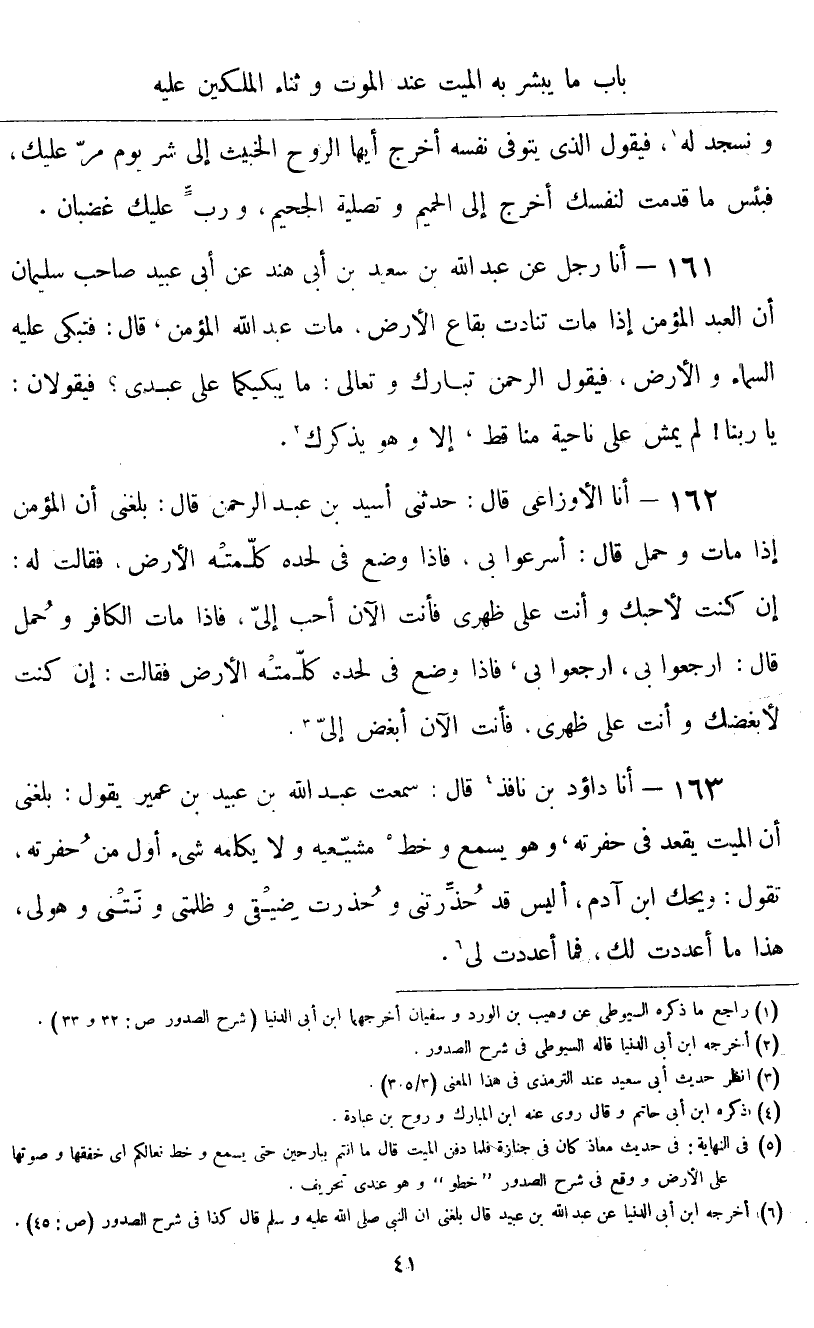 أنا الْأَوْزَاعِيُّ قَالَ: حَدَّثَنِي أُسَيْدُ بْنُ عَبْدِ الرَّحْمَنِ قَالَ: بَلَغَنِي " أَنَّ الْمُؤْمِنَ إِذَا مَاتَ وَحُمِلَ قَالَ: أَسْرِعُوَا بِي، فَإِذَا وُضِعَ فِي لَحْدِهِ كَلَّمَتْهُ الْأَرْضُ، فَقَالَتْ لَهُ: إِنْ كُنْتُ لَأُحِبُّكَ وَأَنْتَ عَلَى ظَهْرِي، فَأَنْتَ الْآنَ أَحَبُّ إِلَيَّ، فَإِذَا مَاتَ الْكَافِرُ وَحُمِلَ قَالَ: ارْجِعُوا بِي، ارْجِعُوا بِي، فَإِذَا وُضِعَ فِي لَحْدِهِ، كَلَّمَتْهُ الْأَرْضُ، فَقَالَتْ: إِنْ كُنْتُ لَأُبْغِضُكَ وَأَنْتَ عَلَى ظَهْرِي، فَأَنْتَ الْآنَ أَبْغَضُ إِلَيَّ "