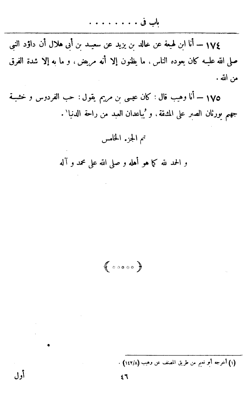 أنا وُهَيْبٌ قَالَ: كَانَ عِيسَى ابْنُ مَرْيَمَ يَقُولُ: «حُبُّ الْفِرْدَوْسِ، وَخَشْيَةُ جَهَنَّمَ يُورِثَانِ الصَّبْرَ عَلَى الْمَشَقَّةِ، وَيُبَاعِدَانِ الْعَبْدَ مِنْ رَاحَةِ الدُّنْيَا»