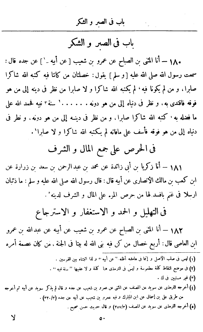 أنا الْمُثَنَّى بْنُ الصَّبَّاحِ، عَنْ عَمْرِو بْنِ شُعَيْبٍ، عَنْ أَبِيهِ، عَنْ جَدَّهِ قَالَ: سَمِعْتُ رَسُولَ اللَّهِ صَلَّى اللهُ عَلَيْهِ وَسَلَّمَ يَقُولُ: «خَصْلَتَانِ مَنْ كَانَتَا فِيهِ كَتَبَهُ اللَّهُ شَاكِرًا صَابِرًا، وَمَنْ لَمْ يَكُونَا فِيهِ، لَمْ يَكْتُبْهُ اللَّهُ شَاكِرًا وَلَا صَابِرًا، مَنْ نَظَرَ فِي دِينِهِ إِلَى مَنْ هُوَ فَوْقَهُ فَاقْتَدَى بِهِ، وَنَظَرَ فِي دُنْيَاهُ إِلَى مَنْ هُوَ دُونَهُ. . . سُنَّةَ نَبِيِّهِ فَحَمِدَ اللَّهَ عَلَى مَا فَضَّلَهُ بِهِ، كَتَبَهُ اللَّهُ شَاكِرًا صَابِرًا، وَمَنْ نَظَرَ فِي دِينِهِ إِلَى مَنْ هُوَ دُونَهُ، وَنَظَرَ فِي دُنْيَاهُ إِلَى مَنْ هُوَ فَوْقَهُ فَأَسِفَ عَلَى مَا فَاتَهُ لَمْ يَكْتُبْهُ اللَّهُ شَاكِرًا وَلَا صَابِرًا»