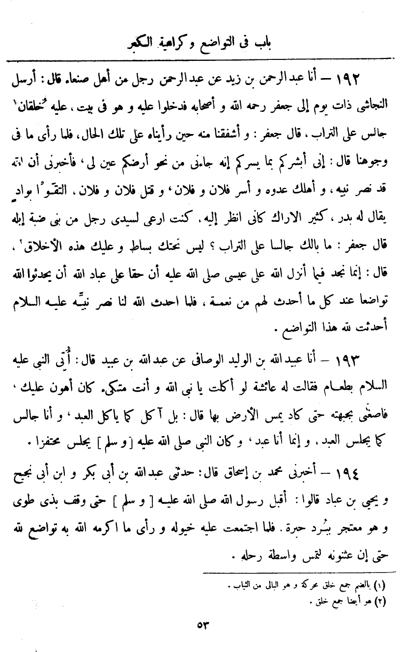 أنا عَبْدُ الرَّحْمَنِ بْنُ زَيْدٍ، عَنْ عَبْدِ الرَّحْمَنِ، رَجُلٍ مِنْ أَهْلِ صَنْعَاءَ قَالَ: أَرْسَلَ النَّجَاشِيُّ ذَاتَ يَوْمٍ إِلَى جَعْفَرٍ رَحِمَهُ اللَّهُ وَأَصْحَابِهِ، فَدَخَلُوا عَلَيْهِ، وَهُوَ فِي بَيْتٍ، عَلَيْهِ خُلْقَانٌ جَالِسٌ عَلَى التُّرَابِ، قَالَ جَعْفَرٌ: وَأَشْفَقْنَا مِنْهُ حِينَ رَأَيْنَاهُ عَلَى تِلْكِ الْحَالِ، فَلَمَّا رَأَى مَا فِي وُجُوهِنَا قَالَ: إِنِّي أُبَشِّرُكُمْ بِمَا يَسُرُّكُمْ، إِنَّهُ جَاءَنِي مِنْ نَحْوِ أَرْضِكُمْ عَيْنٌ لِي، فَأَخْبَرَنِي أَنَّ اللَّهَ قَدْ نَصَرَ نَبِيَّهُ، وَأَهْلَكَ عدُوَّهُ، وَأَسَرَ فُلَانًا وَفُلَانًا، وَقَتَلَ فُلَانًا وَفُلَانًا، الْتَقَوْا بِوَادٍ يُقَالُ لَهُ بَدْرٌ كَثِيرُ الْأَرَاكِ، كَأَنِّي أَنْظُرُ إِلَيْهِ، كُنْتُ أَرْعَى لِسَيِّدِي، رَجُلٍ مِنْ بَنِي ضَبَّةَ إِبِلَهُ، قَالَ جَعْفَرٌ: «مَا بَالُكَ جَالِسًا عَلَى التُّرَابِ؟ لَيْسَ تَحْتَكَ بِسَاطٌ وَعَلَيْكَ هَذِهِ الْأَخْلَاقُ» قَالَ: إِنَّمَا نَجِدُ فِيمَا أَنْزَلَ اللَّهُ عَلَى عِيسَى صَلَّى اللهُ عَلَيْهِ وَسَلَّمَ أَنَّ حَقًّا عَلَى عِبَادِ اللَّهِ أَنْ يُحْدِثُوا لِلَّهِ تَوَاضُعًا عِنْدَ كُلِّ مَا أَحْدَثَ لَهُمْ مِنْ نِعْمَةٍ، فَلَمَّا أَحْدَثَ اللَّهُ لَنَا نَصْرَ نَبِيِّهِ عَلَيْهِ السَّلَامُ أَحْدَثْتُ لِلَّهِ هَذَا التَّوَاضُعَ