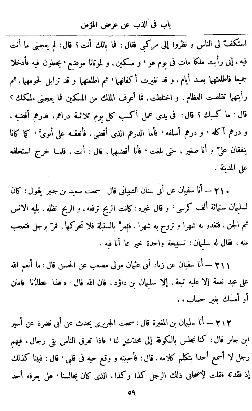 أنا سُفْيَانُ، عَنْ أَبِي سِنَانٍ الشَّيْبَانِيِّ قَالَ: سَمِعْتُ سَعِيدَ بْنَ جُبَيْرٍ يَقُولُ: " كَانَ لِسُلَيْمَانَ سِتُّمِائَةِ أَلْفِ كُرْسِيٍّ، وَقَالَ غَيْرُهُ: كَانَتِ الرِّيحُ تَرْفَعُهُ، وَالرِّيحُ تُظِلُّهُ، يَلِيهِ الْإِنْسُ، ثُمَّ الْجِنُّ، فَتَغْدُو بِهِ شَهْرًا، وَتَرُوحُ بِهِ شَهْرًا، فَتَمُرُّ بِالسُّنْبُلَةِ فَلَا تُحَرِّكُهَا، فَمَرَّ بِرَجُلٍ فَتَعَجَّبَ مِنْهُ، فَقَالَ لَهُ سُلَيْمَانُ: تَسْبِيحَةٌ وَاحِدَةٌ خَيْرٌ مِمَّا أَنَا فِيهِ "