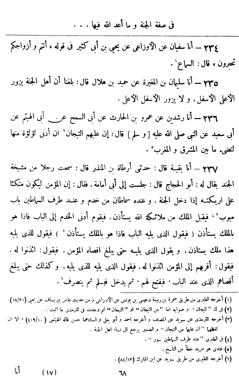 أنا سُلَيْمَانُ بْنُ الْمُغِيرَةِ، عَنْ حُمَيْدِ بْنِ هِلَالٍ قَالَ: بَلَغَنَا «أَنَّ أَهْلَ الْجَنَّةِ، يَزُورُ الْأَعْلَى الْأَسْفَلَ، وَلَا يَزُورُ الْأَسْفَلُ الْأَعْلَى»