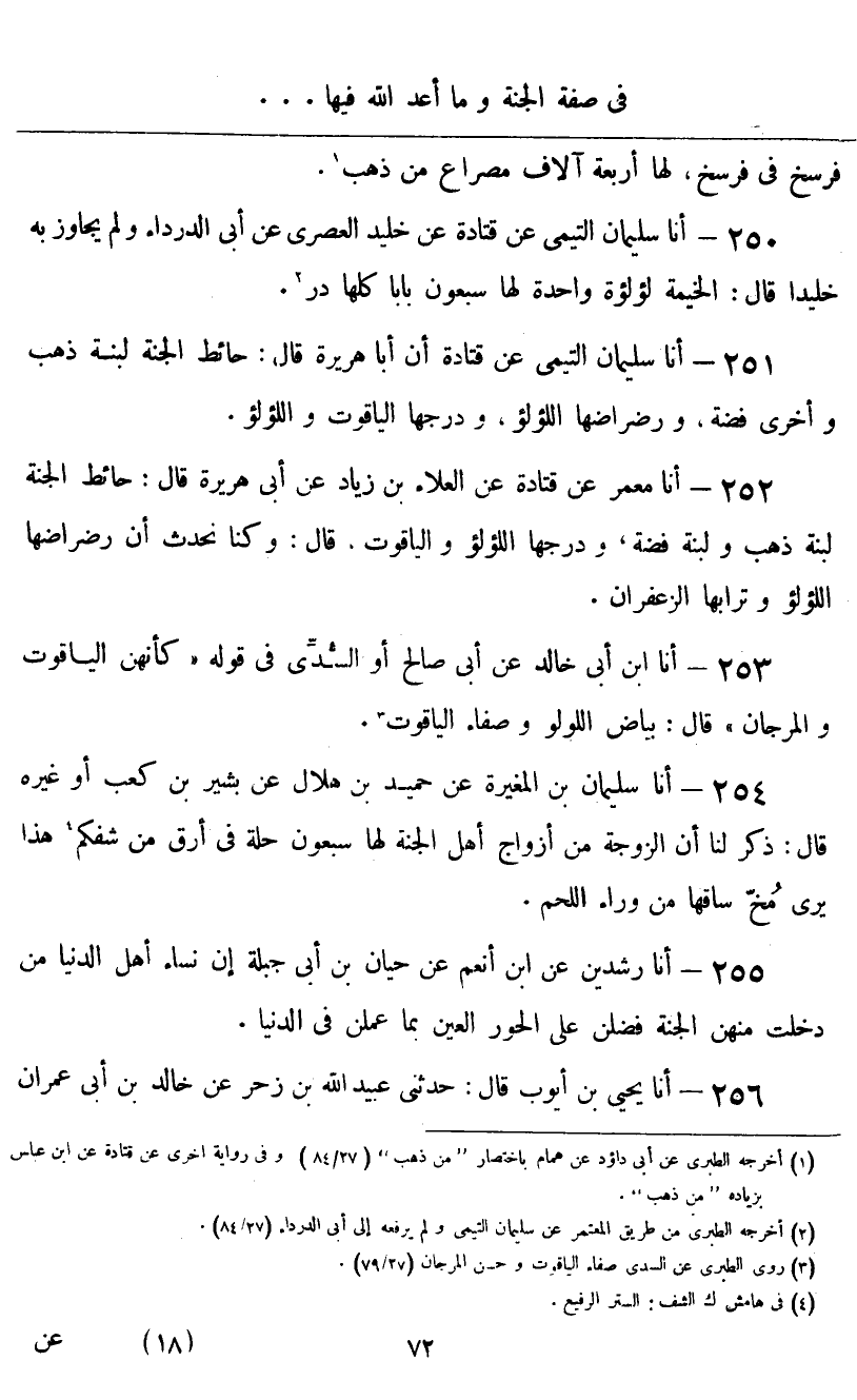 أنا سُلَيْمَانُ التَّيْمِيُّ، أَنَّ قَتَادَةَ، أَنَّ أَبَا هُرَيْرَةَ قَالَ: «حَائِطُ الْجَنَّةِ لَبِنَةٌ ذَهَبٌ، وَأُخْرَى فِضَّةٌ، وَرَضْرَاضُهَا اللُّؤْلُؤُ، وَدَرَجُهَا الْيَاقُوتُ، وَاللُّؤْلُؤُ»