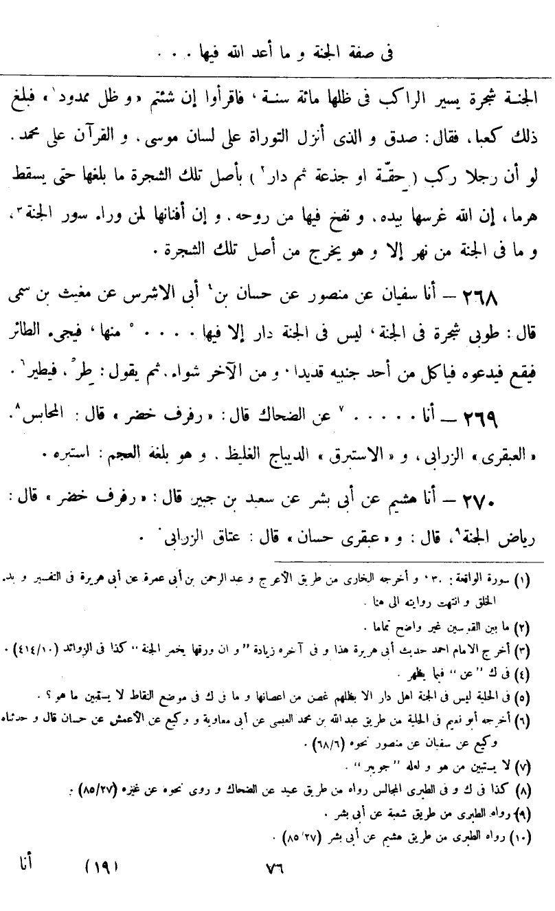 أنا سُفْيَانُ، عَنْ مَنْصُورٍ، عَنْ حَسَّانَ بْنِ أَبِي الْأَشْرَسِ، عَنْ مُغِيثِ بْنِ سُمَيٍّ قَالَ: " طُوبَى شَجَرَةٌ فِي الْجَنَّةِ لَيْسَ فِي الْجَنَّةِ دَارٌ إِلَّا فِيهَا. . . مِنْهَا، فَيَجِيءُ الطَّائِرُ فَيَقَعُ، فَيَدْعُوهُ فَيَأْكُلُ مِنْ أَحَدِ جَنْبَيْهِ قَدِيدًا، وَمِنَ الْآخَرِ شِوَاءً، ثُمَّ يَقُولُ: طِرْ فَيَطِيرُ "