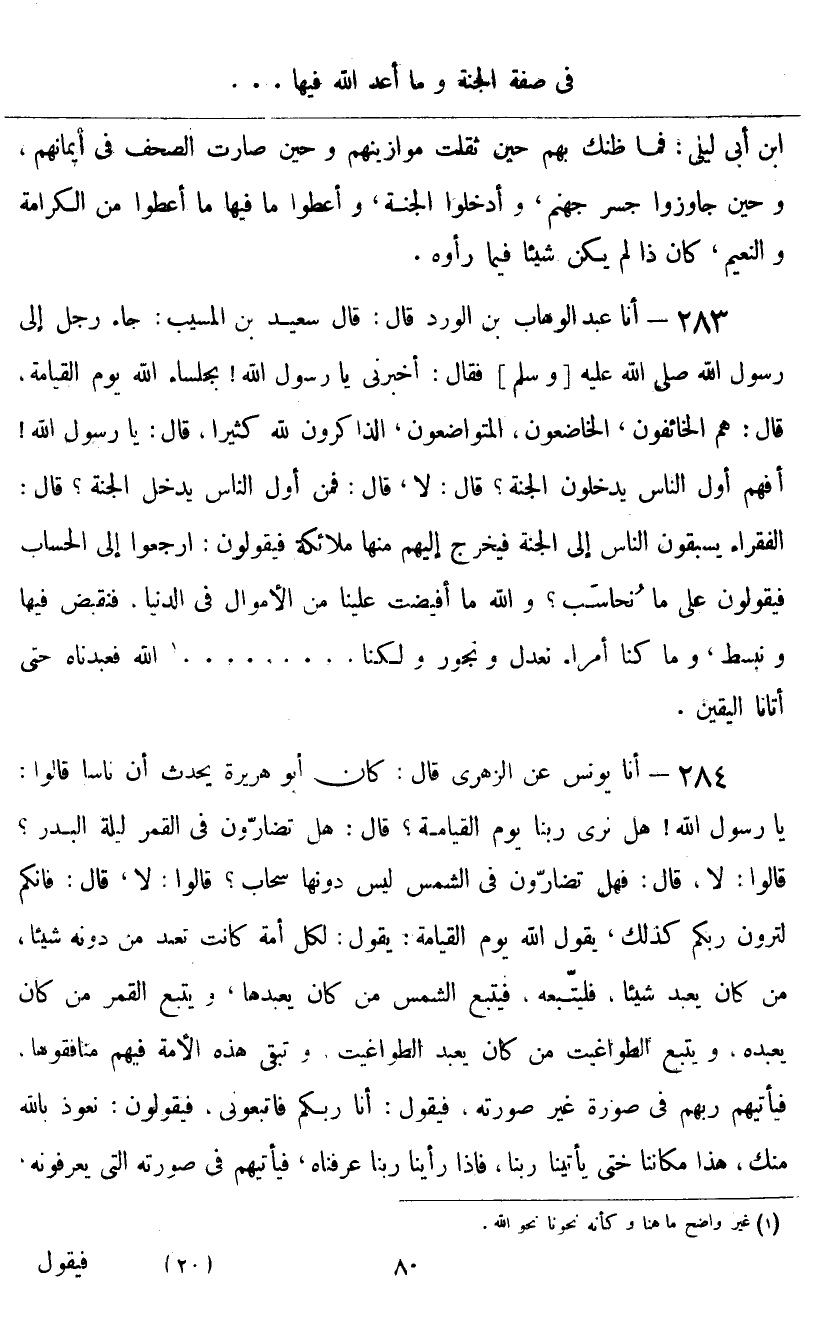 أنا يُونُسُ، عَنِ الزُّهْرِيِّ قَالَ: كَانَ أَبُو هُرَيْرَةَ يُحَدِّثُ: أَنَّ نَاسًا قَالُوا: يَا رَسُولَ اللَّهِ، هَلْ نَرَى رَبَّنَا يَوْمَ الْقِيَامَةِ؟ قَالَ: «هَلْ تُضَارُّونَ فِي الْقَمَرِ لَيْلَةَ الْبَدْرِ؟» قَالُوا: لَا قَالَ: «فَهَلْ تُضَارُّونَ فِي الشَّمْسِ لَيْسَ دُونَهَا سَحَابٌ؟» قَالُوا: لَا، فَقَالَ: " فَإِنَّكُمْ لتَرَوْنَ رَبَّكُمْ، كَذَلِكَ يَقُولُ اللَّهُ يَوْمَ الْقِيَامَةِ: يَقُولُ: لِكُلِّ أُمَّةٍ كَانَتْ تَعْبُدُ مِنْ دُونِهِ شَيْئًا، مَنْ كَانَ يَعْبُدُ شَيْئًا فَلْيَتْبَعْهُ، فَيَتْبَعُ الشَّمْسَ مَنْ كَانَ يَعْبُدُهَا، وَيَتْبَعُ الْقَمَرَ مَنْ كَانَ يَعْبُدُهُ، وَيَتْبَعُ الطَّوَاغِيتَ مَنْ كَانَ يَعْبُدُ الطَّوَاغِيتَ، وَتَبْقَى هَذِهِ الْأُمَّةُ فِيهِمْ مُنَافِقُوهَا، فَيَأْتِيهِمْ رَبُّهُمْ فِي صُورَةٍ غَيْرِ صُورَتِهِ، فَيَقُولُ: أَنَا رَبُّكُمْ فَاتْبَعُونِي، فَيَقُولُونَ: نَعُوذُ بِاللَّهِ مِنْكَ، هَذَا مَكَانُنَا حَتَّى يَأْتِيَنَا رَبُّنَا، فَإِذَا رَأَيْنَا رَبَّنَا عَرَفْنَاهُ، فَيَأْتِيهِمْ فِي صُورَتِهِ الَّتِي يَعْرِفُونَهُ ⦗٨١⦘، فَيَقُولُ: أَنَا رَبُّكُمْ، فَيَقُولُونَ: أَنْتَ رَبُّنَا فَيَتْبَعُونَهُ، وَيُضْرَبُ الصِّرَاطُ الْمُسْتَقِيمُ بَيْنَ ظَهْرَيْ جَهَنَّمَ "، قَالَ رَسُولُ اللَّهِ صَلَّى اللهُ عَلَيْهِ وَسَلَّمَ: " فَأَكُونُ أَنَا وَأُمَّتِي أَوَّلَ مَنْ يَجُوزُ عَلَى الصِّرَاطِ الْمُسْتَقِيمِ، وَلَا يَتَكَلَّمُ يَوْمَئِذٍ أَحَدٌ إِلَّا الرُّسُلُ، وَقَوْلُهُمْ يَوْمَئِذٍ: اللَّهُمَّ سَلِّمْ سَلِّمْ "، قَالَ أَبُو هُرَيْرَةَ: قَالَ رَسُولُ اللَّهِ: «فَأَجْتَازُ بِأُمَّتِي، وَفِي النَّارِ كَلَالِيبُ مِثْلُ شَوْكِ السَّعْدَانِ، هَلْ رَأَيْتُمْ شَوْكَ السَّعْدَانِ؟» قَالُوا: نَعَمْ قَالَ: " فَإِنَّهَا مِثْلُهُ، غَيْرَ أَنَّهُ لَا يَعْلَمُ قَدْرَ عِظَمِهَا إِلَّا اللَّهُ، فَتَخْطَفُ النَّاسَ بِأَعْمَالِهِمْ، فَالْمُوبَقُ فِي جَهَنَّمَ بِعَمَلِهِ، وَالْمُخَرْدَلُ، ثُمَّ يَنْجُو، فَإِذَا فَرَغَ اللَّهُ مِنَ الْقَضَاءِ بَيْنَ الْعِبَادِ، فَأَرَادَ رَحْمَةَ مَنْ أَرَادَ مِمَّنْ فِي النَّارِ، أَمَرَ الْمَلَائِكَةَ أَنْ يُخْرِجُوا مِنْ جَهَنَّمَ مَنْ أَرَادَ، فَيُخْرِجُونَهُمْ وَيُعلِّمُونَهُمْ بِآثَارِ السُّجُودِ، فَيُخْرِجُونَهُمْ وَقَدِ امْتَحَشُوا، فَيُصَبُّ عَلَيْهِمْ مَاءُ الْحَيَاةِ، فَيَنْبُتُونَ نَبَاتَ الْحَبَّةِ فِي حَمِيلِ السَّيْلِ، حَتَّى يَبْقَى رَجُلٌ مِنْ آخِرِ أَهْلِ الْجَنَّةِ دُخُولًا، قَاعِدًا بَيْنَ الْجَنَّةِ وَالنَّارِ، مُقْبِلًا بِوَجْهِهِ إِلَى جَهَنَّمَ، فَيَقُولُ: يَا رَبِّ، اصْرِفْ وَجْهِي عَنِ النَّارِ، أَحْرَقَنِي ذَكَاؤُهَا، وَقشَبَنِي رِيحُهَا، فَيَقُولُ اللَّهُ عَزَّ وَجَلَّ لَهُ: فَعَسَيْتَ إِنْ فُعِلَ ذَلِكَ بِكَ أَنْ تَسْأَلَ غَيْرَهُ؟ فَيَقُولُ: لَا، فَيُعْطِي رَبَّهُ مِنَ الْعُهُودِ وَالْمَوَاثِيقِ مَا شَاءَ اللَّهُ، فَيَصْرِفُ اللَّهُ وَجْهَهُ عَنِ النَّارِ قِبَلَ الْجَنَّةِ، فَإِذَا برَزَتْ لَهُ الْجَنَّةُ ⦗٨٢⦘ سَكَتَ مَا شَاءَ اللَّهُ أَنْ يَسْكُتَ، ثُمَّ يَقُولُ: يَا رَبِّ، قَدِّمْنِي عِنْدَ بَابِ الْجَنَّةِ، فَيَقُولُ اللَّهُ: أَلَيْسَ قَدْ أَعْطَيْتَ مِنَ الْعُهُودِ وَالْمَوَاثِيقِ أَنْ لَا تَسْأَلَ اللَّهَ غَيْرَ الَّذِي أُعْطِيتَ؟ فَيَقُولُ: يَا رَبِّ، لَا تَجْعَلْنِي أَشْقَى خَلْقِكَ بِكَ، فَيُقَدِّمُهُ اللَّهُ إِلَى بَابِ الْجَنَّةِ، فَإِذَا بَلَغَ بَابَ الْجَنَّةِ، انْفَهَقَتْ لَهُ الْجَنَّةُ، فَرَأَى مَا فِيهَا مِنَ الْبَهْجَةِ وَالنَّضْرَةِ وَالسُّرُورِ، فَيَسْكُتُ مَا شَاءَ اللَّهُ أَنْ يَسْكُتَ، ثُمَّ يَقُولُ: يَا رَبِّ، أَدْخِلْنِي الْجَنَّةَ، فَ