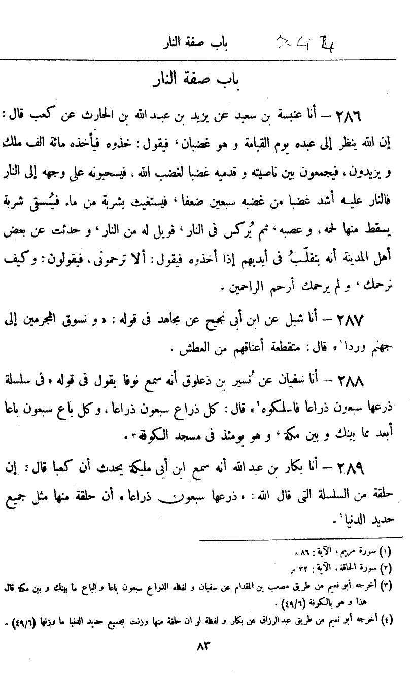 أنا بَكَّارُ بْنُ عَبْدِ اللَّهِ، أَنَّهُ سَمِعَ ابْنَ أَبِي مُلَيْكَةَ يُحَدِّثُ، أَنَّ كَعْبًا قَالَ: إِنَّ حَلْقَةً مِنَ السِّلْسِلَةِ الَّتِي قَالَ اللَّهُ: {ذَرْعُهَا سَبْعُونَ ذِرَاعًا} [الحاقة: ٣٢] «أَنَّ حَلْقَةً مِنْهَا مِثْلُ جَمِيعِ حَدِيدِ الدُّنْيَا»
