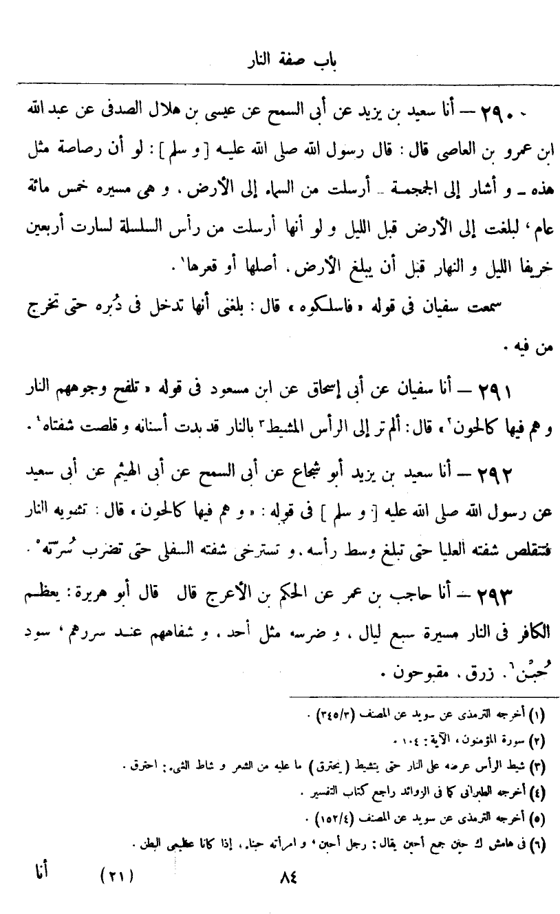 أنا سَعِيدُ بْنُ يَزِيدَ، عَنْ أَبِي السَّمْحِ، عَنْ عِيسَى بْنِ هِلَالٍ الصَّدَفِيِّ، عَنْ عَبْدِ اللَّهِ بْنِ عَمْرِو بْنِ الْعَاصِ قَالَ: قَالَ رَسُولُ اللَّهِ صَلَّى اللهُ عَلَيْهِ وَسَلَّمَ: «لَوْ أَنَّ رَصَاصَةً مِثْلَ هَذِهِ ـ وَأَشَارَ إِلَى الْجُمْجُمَةِ - أُرْسِلَتْ مِنَ السَّمَاءِ إِلَى الْأَرْضِ، وَهِيَ مَسِيرَةُ خَمْسِ مِائَةِ عَامٍ لَبَلَغَتْ إِلَى الْأَرْضِ قَبْلَ اللَّيْلِ، وَلَوْ أَنَّهَا أُرْسِلَتْ مِنْ رَأْسِ السِّلْسِلَةِ لَسَارَتْ أَرْبَعِينَ خَرِيفًا اللَّيْلَ وَالنَّهَارَ، قَبْلَ أَنْ يَبْلُغَ الْأَرْضَ أَصْلُهَا أَوْ قَعْرُهَا» سَمِعْتُ سُفْيَانَ فِي قَوْلِهِ: {فَاسْلُكُوهُ} [الحاقة: ٣٢] قَالَ: بَلَغَنِي «أَنَّهَا تَدْخُلُ فِي دُبُرِهِ حَتَّى تَخْرُجَ مِنْ فِيهِ»