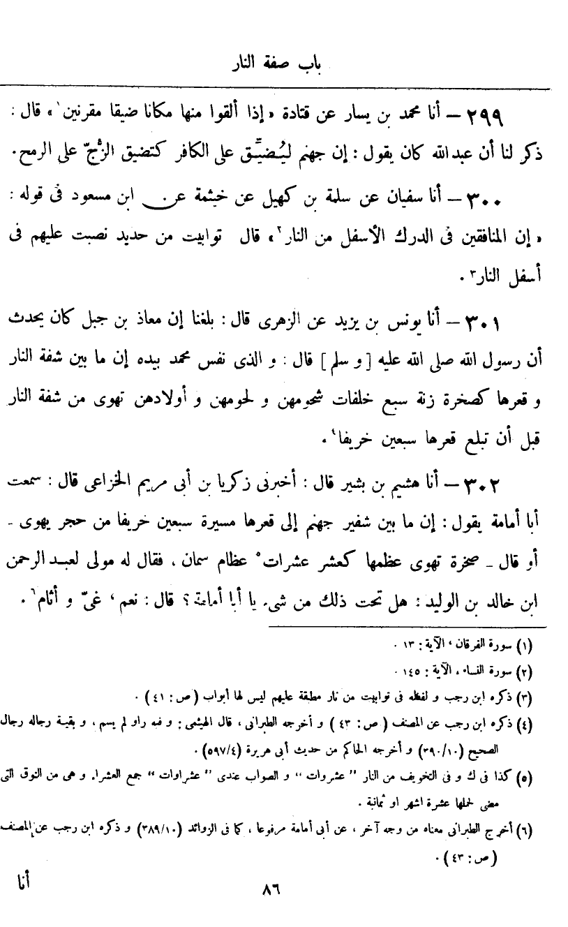 أنا هُشَيْمُ بْنُ بَشِيرٍ قَالَ: أَخْبَرَنِي زَكَرِيَّا بْنُ أَبِي مَرْيَمَ الْخُزَاعِيُّ قَالَ: سَمِعْتُ أَبَا أُمَامَةَ يَقُولُ: «إِنَّ مَا بَيْنَ شَفِيرِ جَهَنَّمَ إِلَى قَعْرِهَا، مَسِيرَةَ سَبْعِينَ خَرِيفًا مِنْ حَجَرٍ يَهْوِي» أَوْ قَالَ: «صَخْرَةٍ تَهْوِي، عِظَمُهَا كَعَشْرِ عُشَرَاوَاتٍ عِظَامٍ سِمَانٍ» فَقَالَ لَهُ مَوْلًى لِعَبْدِ الرَّحْمَنِ بْنِ خَالِدِ بْنِ الْوَلِيدِ: هَلْ تَحْتَ ذَلِكَ مِنْ شَيْءٍ يَا أَبَا أُمَامَةَ؟ قَالَ: «نَعَمْ، غِيٌّ وَأَثَامٌ»