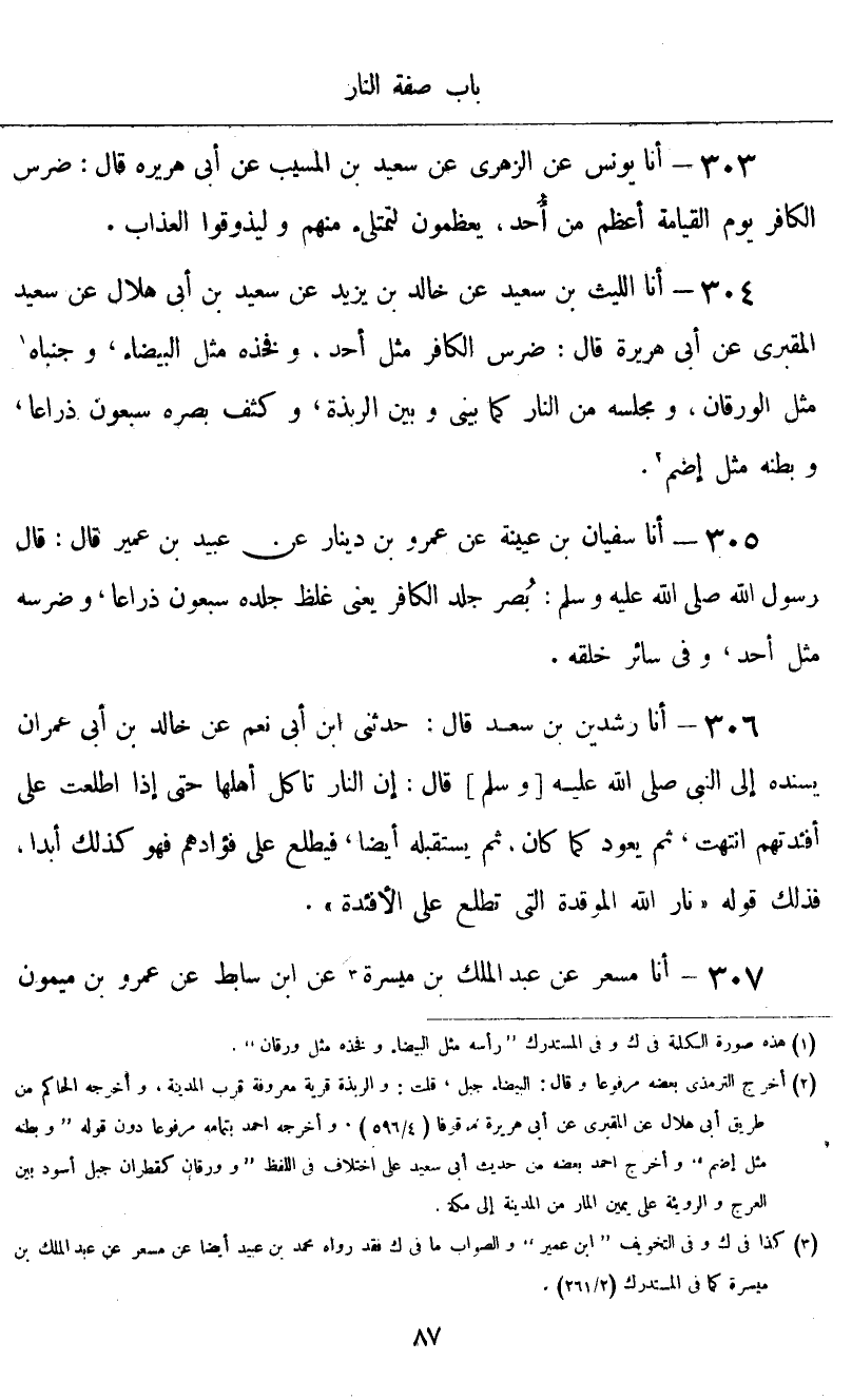 أَنَا اللَّيْثُ بْنُ سَعِيدٍ، عَنْ خَالِدِ بْنِ يَزِيدَ، عَنْ سَعِيدِ بْنِ أَبِي هِلَالٍ، عَنْ سَعِيدٍ الْمَقْبُرِيِّ، عَنْ أَبِي هُرَيْرَةَ قَالَ: «ضِرْسُ الْكَافِرِ مِثْلُ أُحُدٍ، وَفَخِذُهُ مِثْلُ الْبَيْضَاءِ، وَجَنْبَاهُ مِثْلُ الْوَرَقَانِ، وَمَجْلِسُهُ مِنَ النَّارِ كَمَا بَيْنِي وَبَيْنَ الرَّبَذَةِ، وَكَثُفُ بَصَرِهِ سَبْعُونَ ذِرَاعًا، وَبَطْنُهُ مِثْلُ إِضَمٍ»